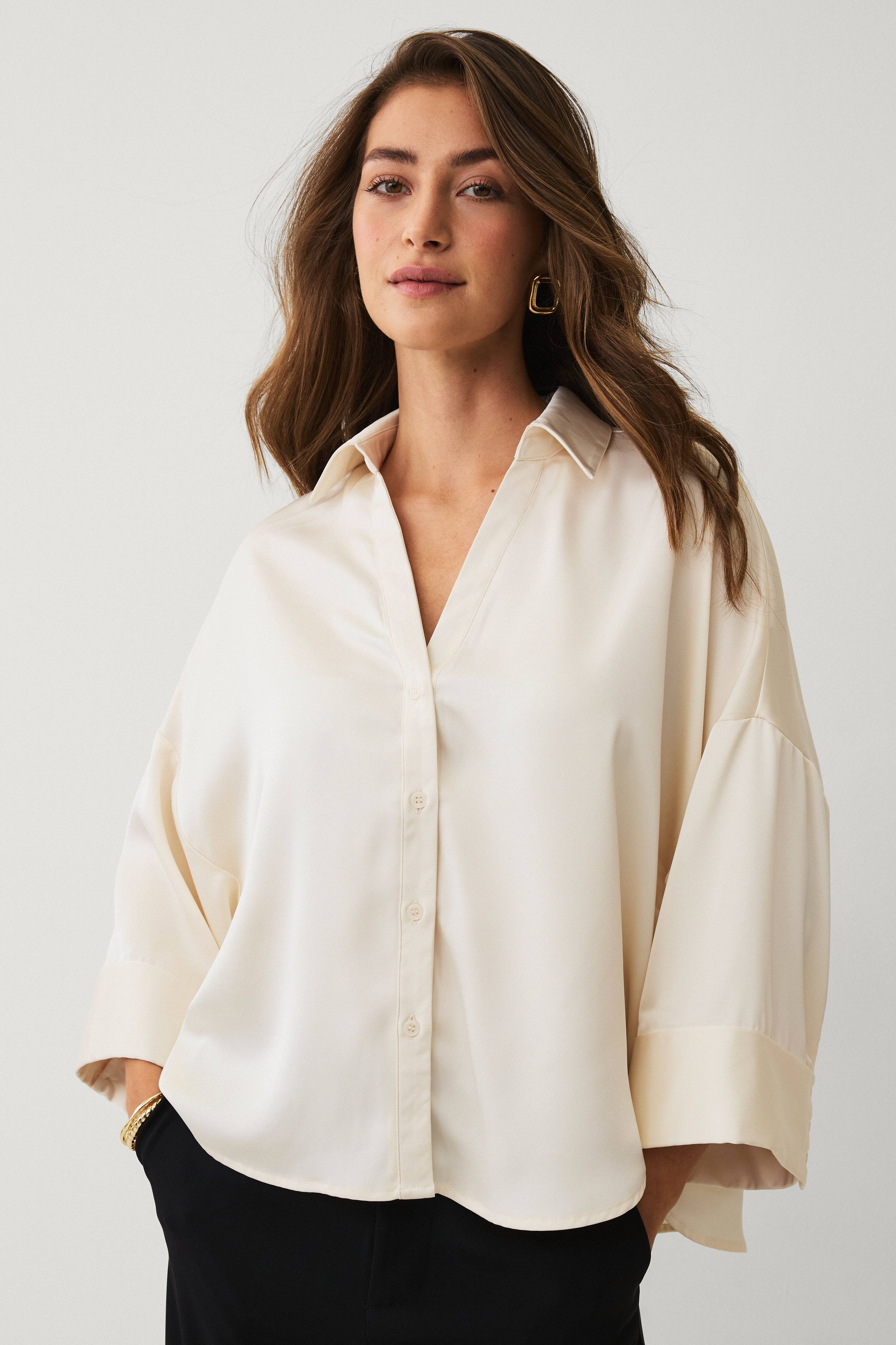 • Bluse aus Satin mit Knöpfen vorne• V-förmiger Nacken mit Kragen• Tief angesetzte Schultern• Breite, 3/4-lange Ärmel mit gesteppten Bündchenen• Runder Saum mit längerer Rückseite• Kellerfalte oben am Rücken• Länge: 66 cm in Größe S