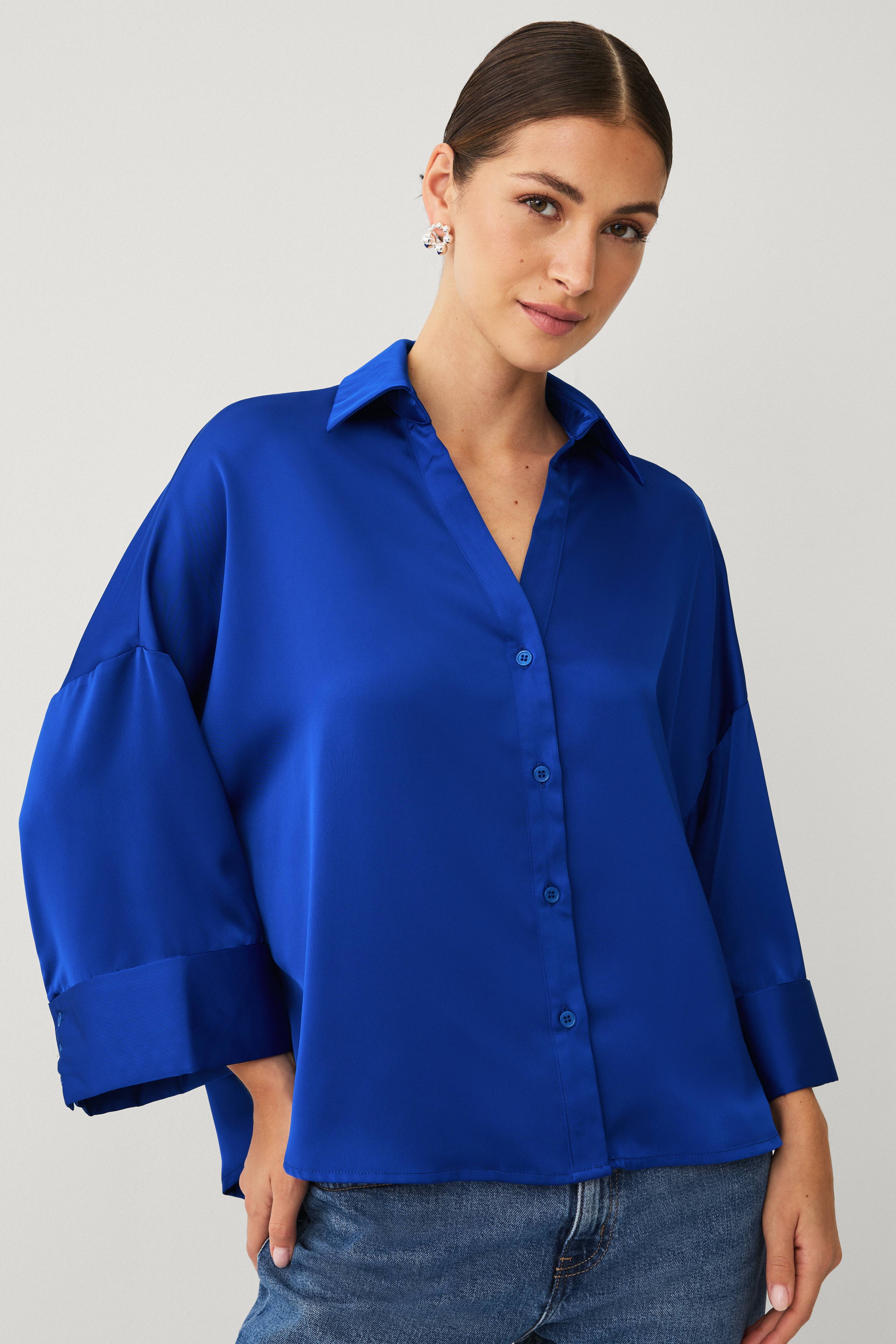 • Bluse aus Satin mit Knöpfen vorne• V-förmiger Nacken mit Kragen• Tief angesetzte Schultern• Breite, 3/4-lange Ärmel mit gesteppten Manschetteern• Runder Saum mit längerer Rückseite• Kellerfalte oben am Rücken• Länge: 66 cm in Größe S