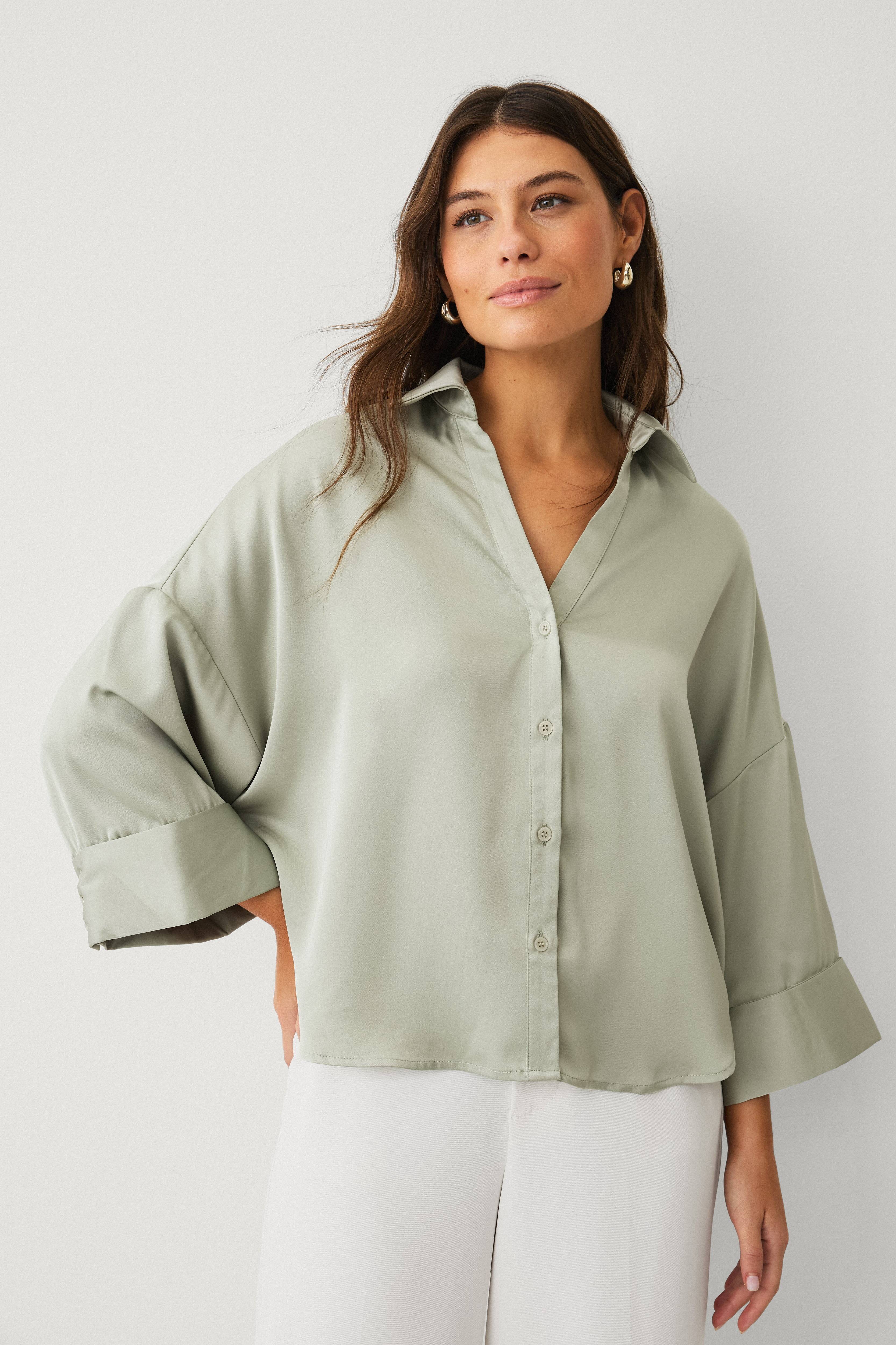• Bluse aus Satin mit Knöpfen vorne• V-förmiger Nacken mit Kragen• Tief angesetzte Schultern• Breite, 3/4-lange Ärmel mit gesteppten Manschetteern• Runder Saum mit längerer Rückseite• Kellerfalte oben am Rücken• Länge: 66 cm in Größe S