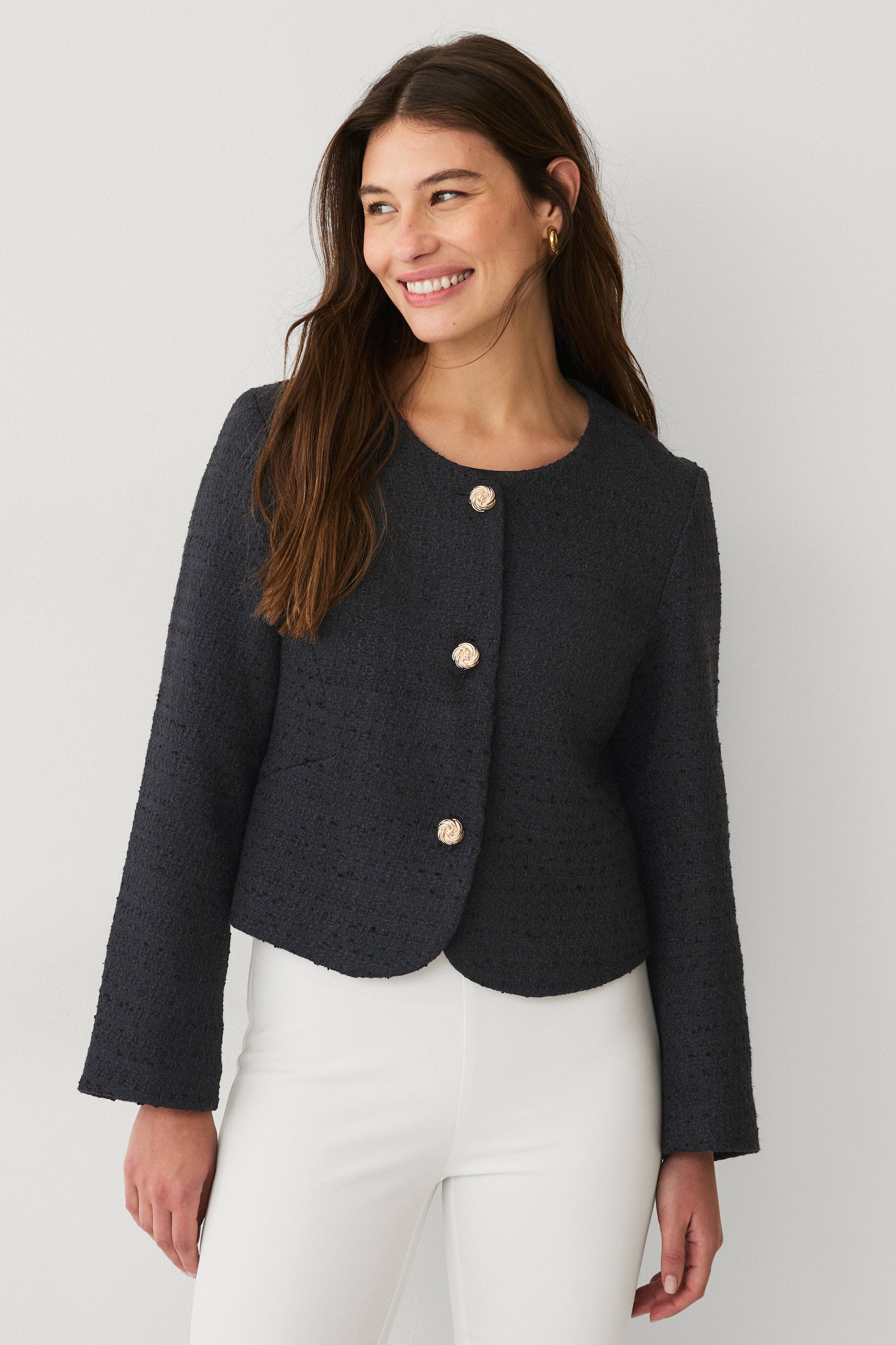 • Kurzes, in einem Strukturmuster gewebtes Modell• Rundhalsausschnitt• Goldfarbene Knöpfe• Runder Saum mitten an der Vorderseite• Langer Ärmel• Gefüttert• Länge: 51 cm in Größe S