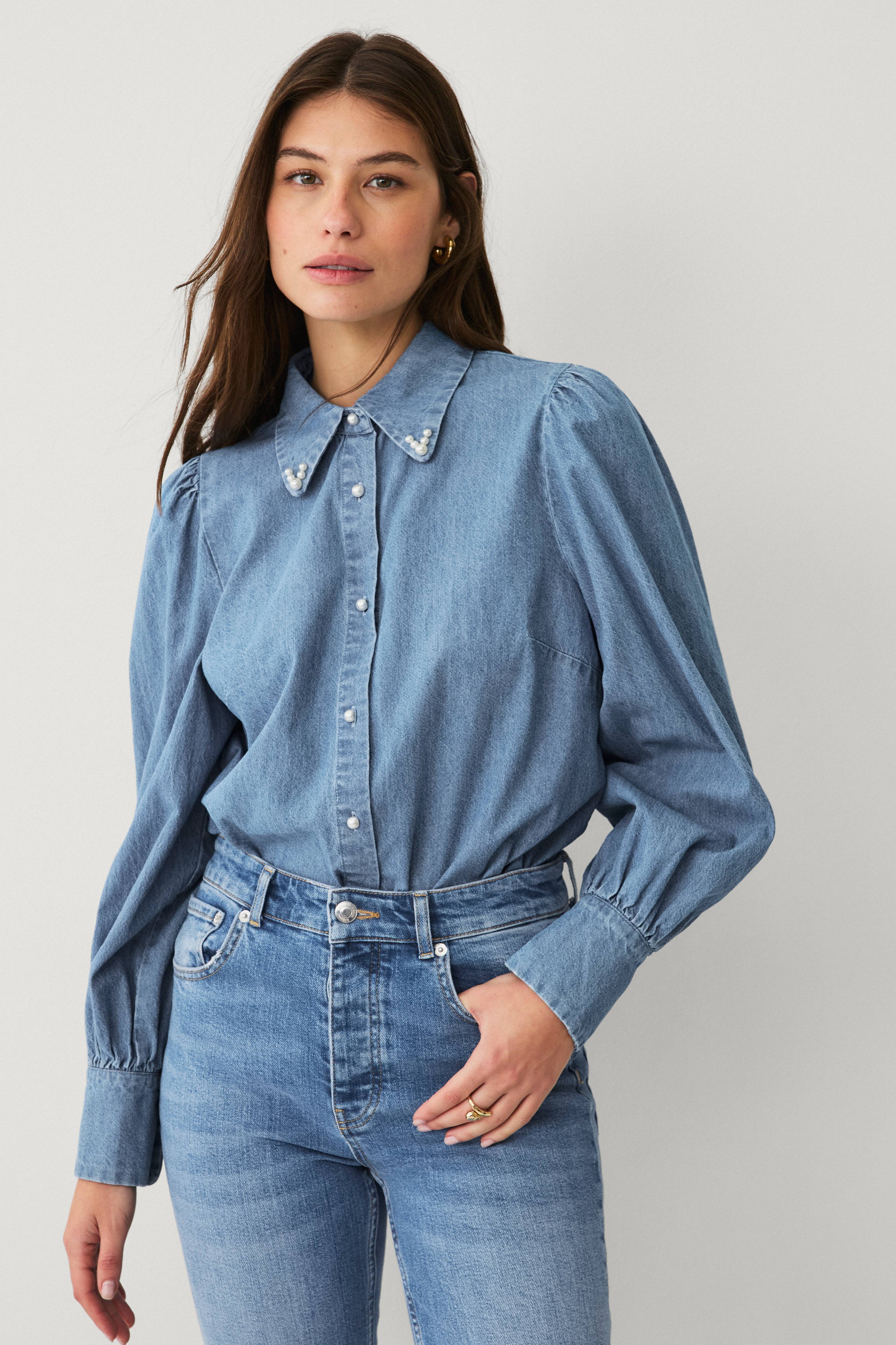 • Jeanshemd mit Ballonärmel und Perlen-Details• Hemdkragen mit angenähtem Perlen-Detail• Knopfleiste vorne mit Perlenknöpfen• Langer Puffärmel mit Shirtmanschette und Perlenknopf• Abnäher an der Büste• Länge: 70 cm in Größe S