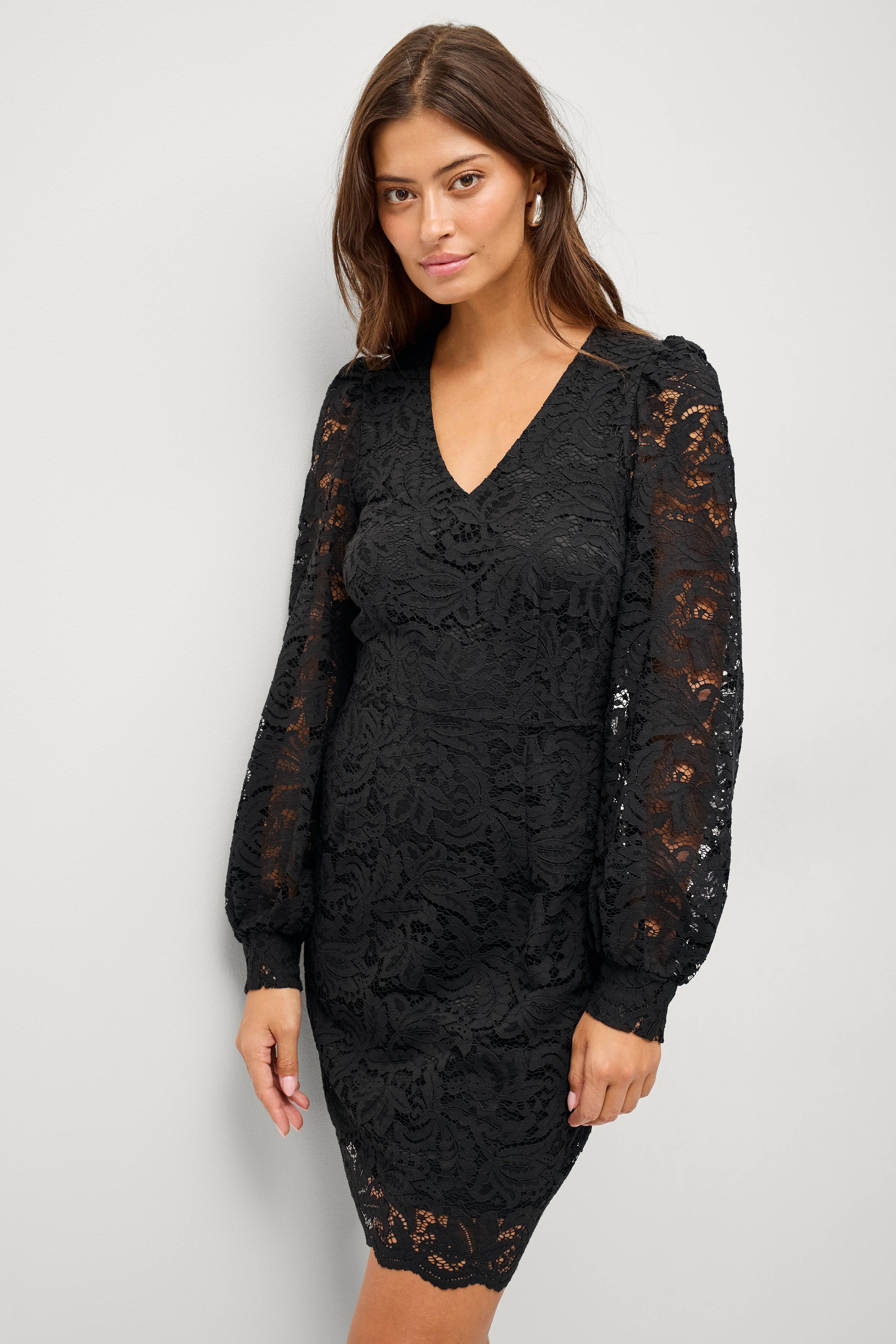 • Figurbetontes Modell aus Spitze • V-förmiger Nacken • Definierte Taille • Langer Ballonärmel mit Manschette und überzogenen Knöpfen • Gefüttert • Länge: 93 cm in Größe 36