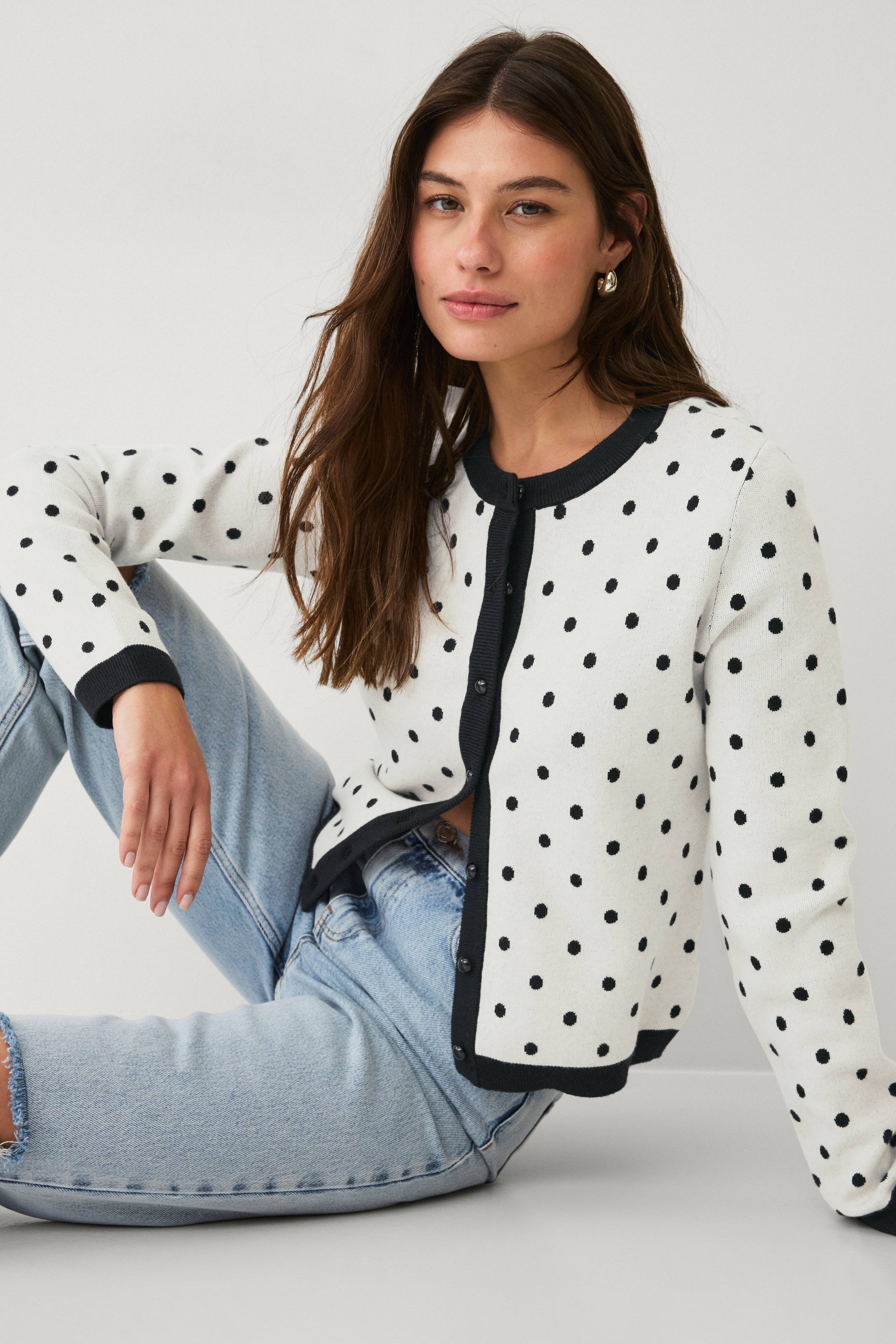 • Langärmliger Cardigan mit einem Feinstrick und getupftem Muster• Runder Ausschnitt im Rippenstrick• Rippenstrick an den Manschetten und unten• Knopfleiste vorne mit kleinen Knöpfen vorne• Länge: 56 cm in Größe S