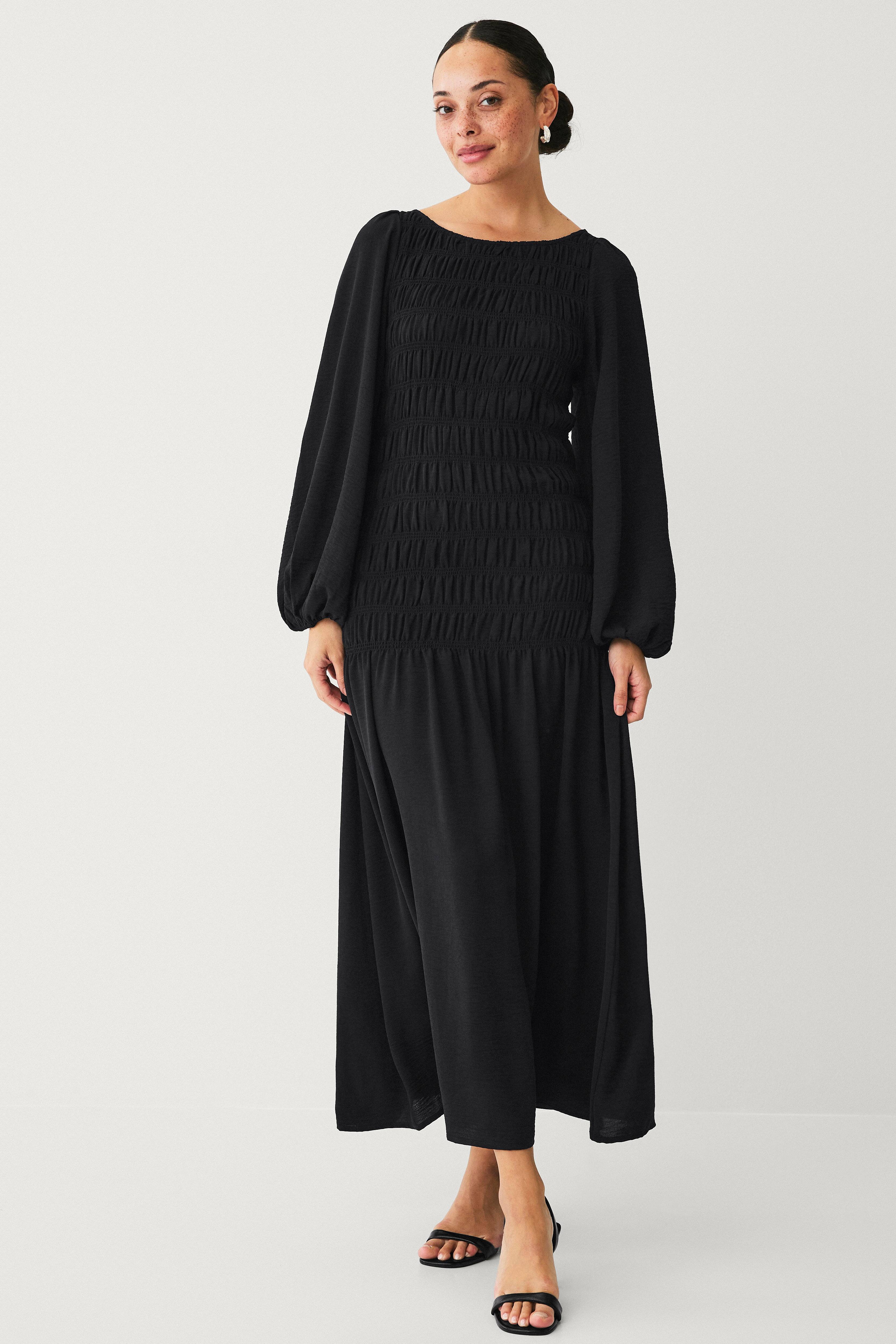 • Langes, langärmliges Kleid aus gewebtem Material mit Smoking• Runder, breiter Ausschnitt• Volantärmel mit Gummiband an den Manschetten• Rüschenrock unten