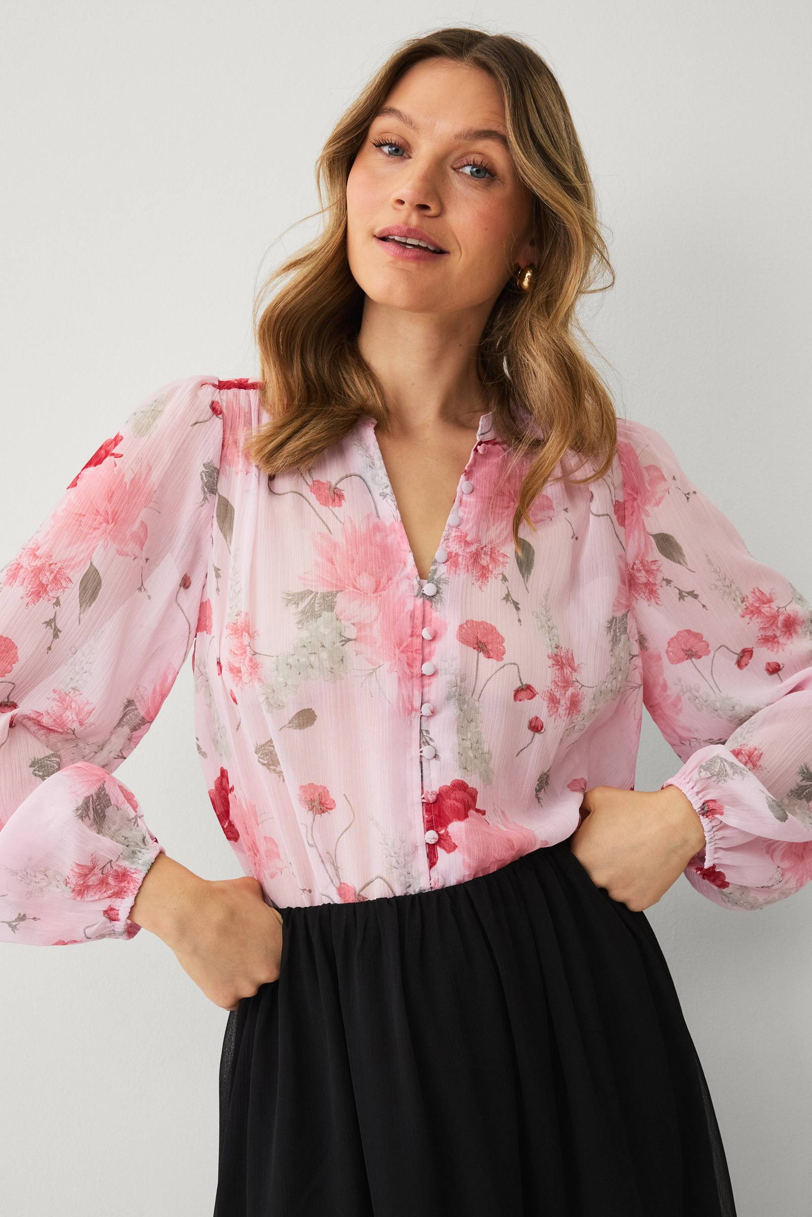 • Transparente Bluse aus strukturiertem Chiffon• V-Ausschnitt• Überzogene Knöpfe• Ballonärmel mit elastischen Ärmelendeern• Länge: 63 cm in Größe S