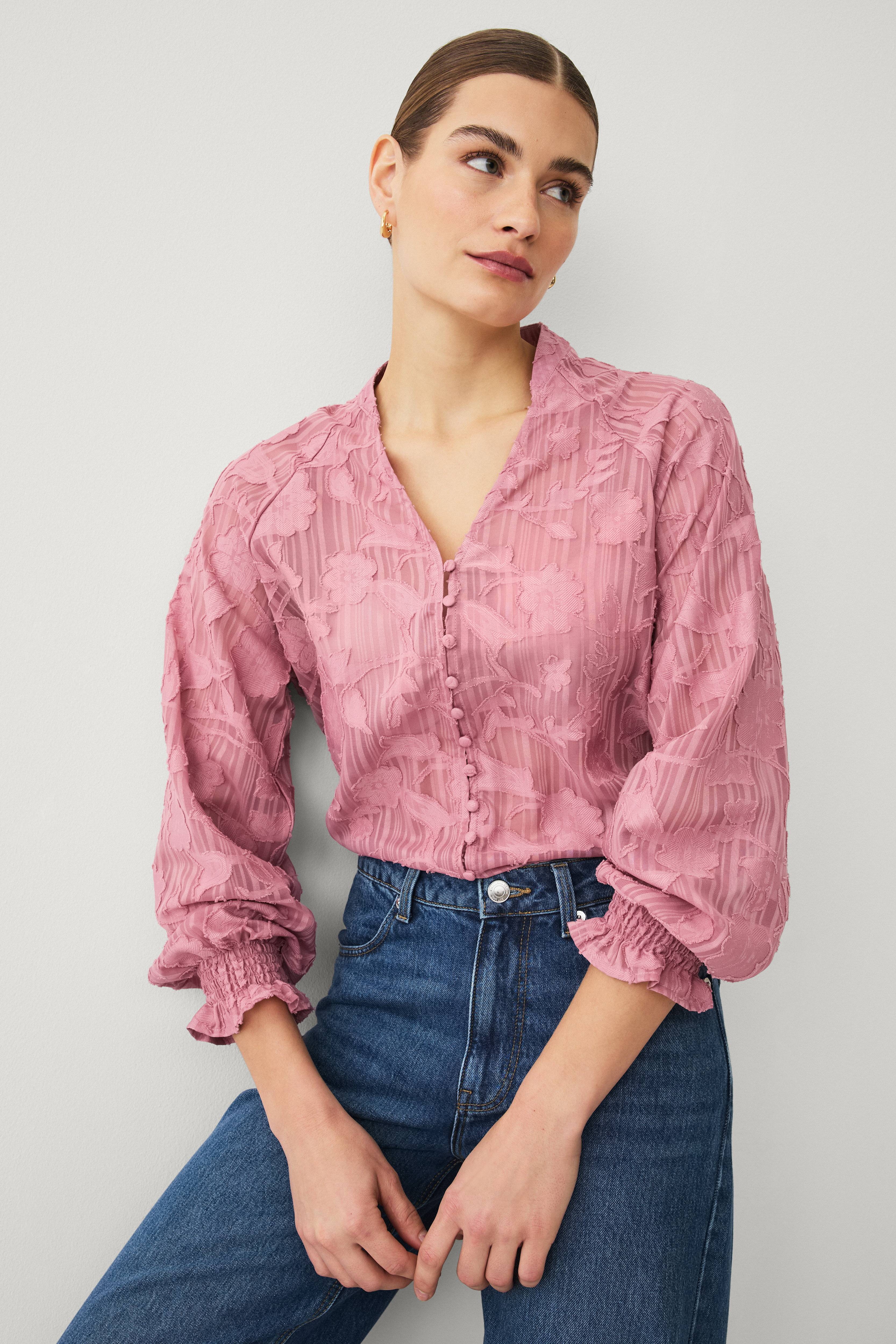 • Halbtransparente Bluse mit Details mit Jacquard-Gewebe• V-Ausschnitt• Lange Raglanärmel• Volant an den Ärmelenden• Knopfverschluss• Normale Passform• Länge: 57 cm in Größe S
