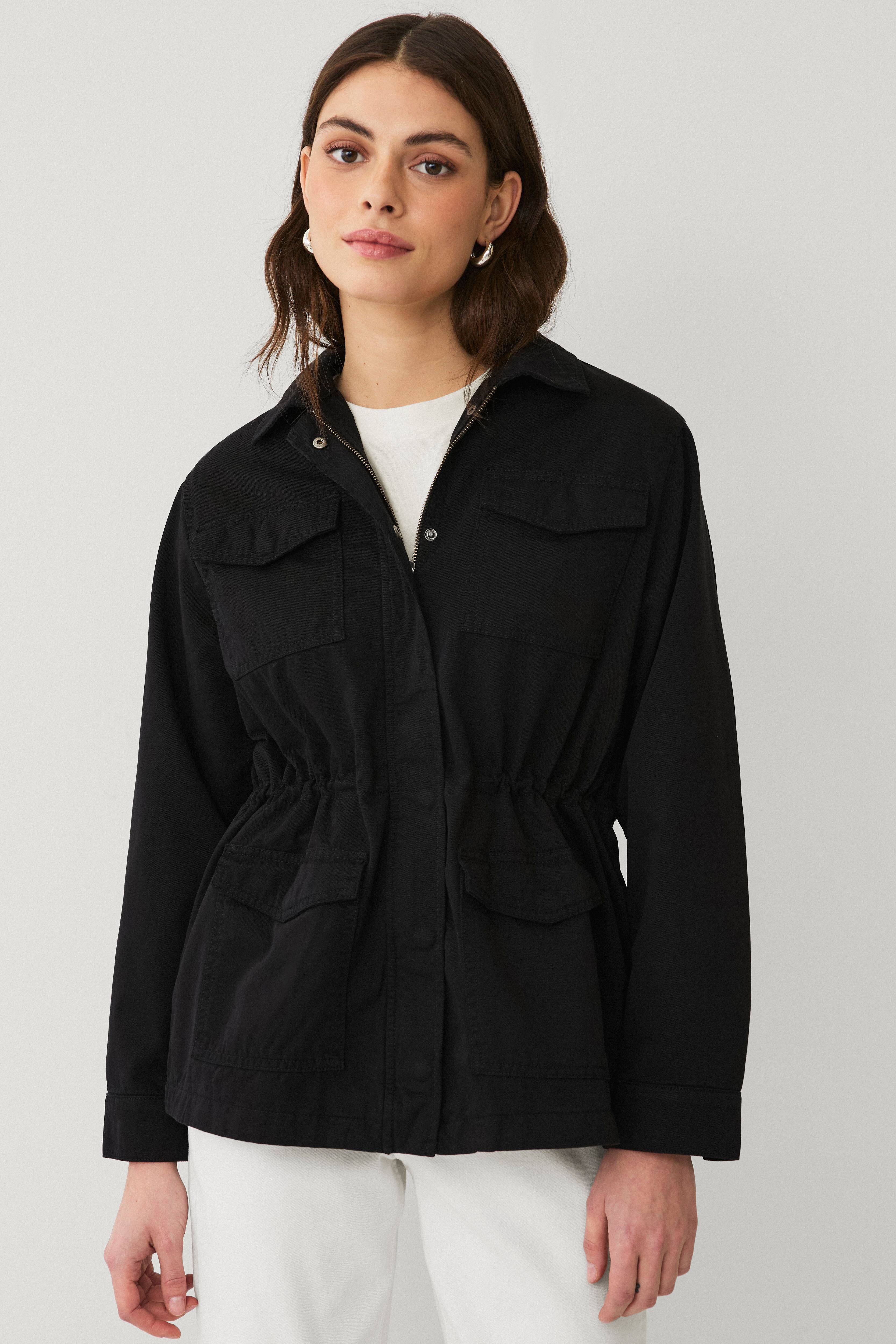 • Cargo-Jacke aus Baumwoll-Köper • Reißverschluss • Sturmklappe über dem Reißverschluss mit Druckknöpfen • Vier Taschen mit Taschenklappen und verstecktem Druckknopf • Innerer Kordelzug in der Taille • Knopf an den Manschetten • Länge: 72 cm in Größe S