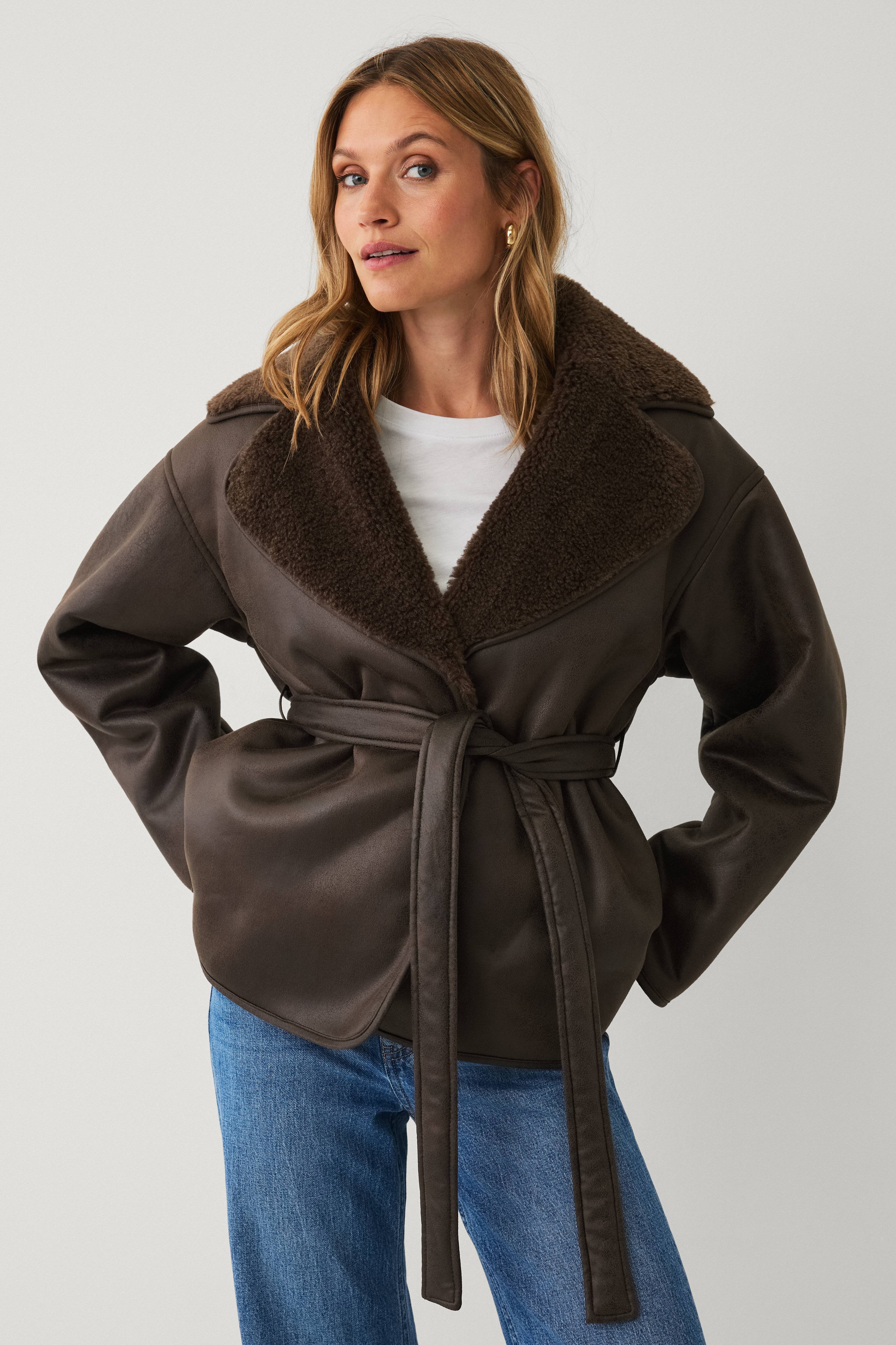 • Weiche Jacke aus Kunstleder• Textilfutter aus Kunstpelz• Kragen• Knopfleiste auf der Oberseite• Abnehmbarer Bindegürtel in der Taille• Seitentaschen• Oversize Passform• Länge: 85 cm in Größe M