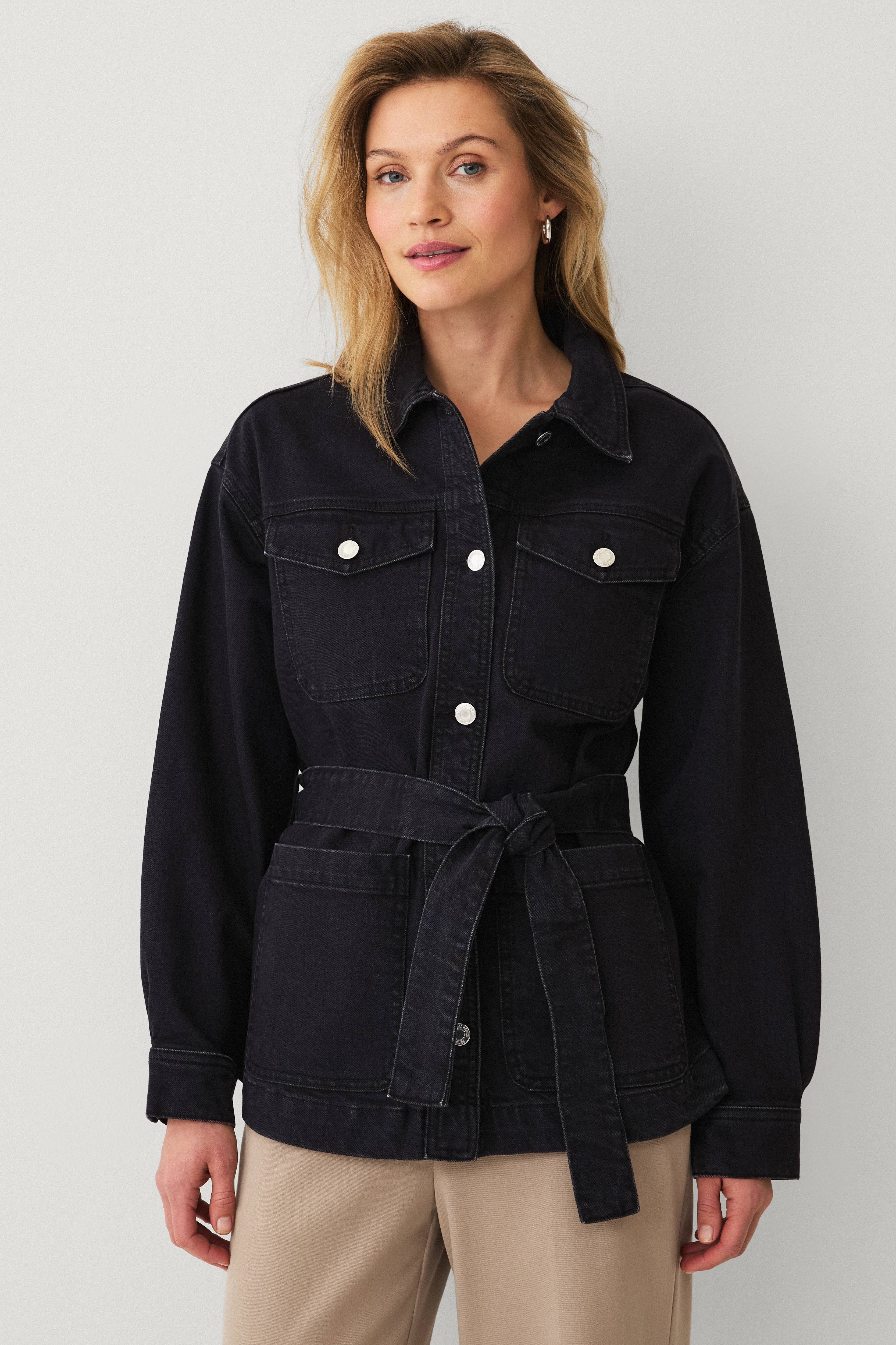 • Jeansjacke mit Gürtel zum Selberbinden• Kragen• Schlitz mit Knopf an den Bündchen• Knopfverschluss• Zwei Brusttaschen mit Klappe• Zwei offene Taschen• Oversize Passform• Länge: 69 cm in Größe S