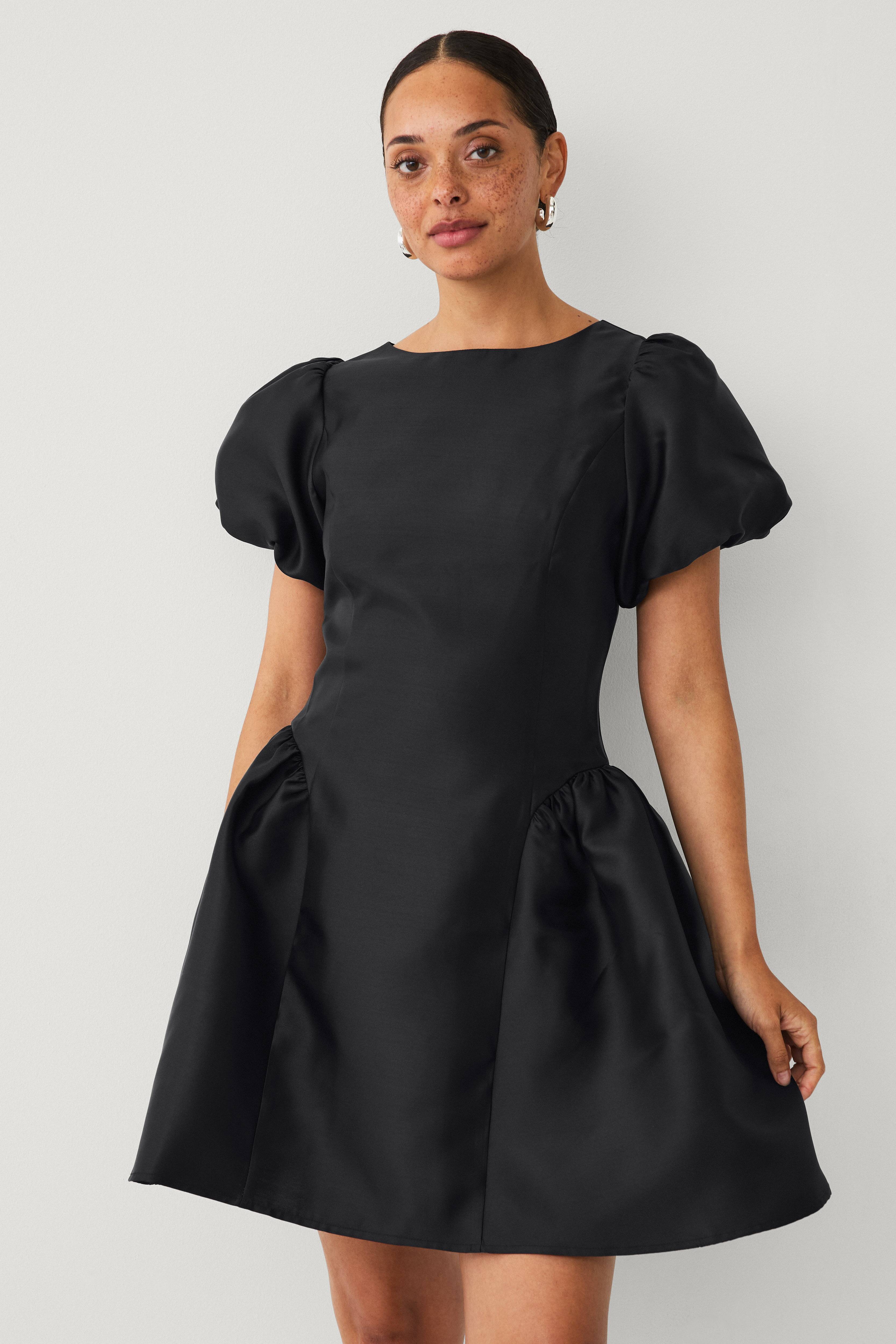 • Schimmerndes Modell aus Satin• Runder Ausschnitt• Kurze Puffärmel• Gummiband an den Manschetten• Versteckter Reißverschluss am Rücken• Ausgestellter, puffiger unterer Teil• Schmale Passform• Länge: 92 cm in Größe 36