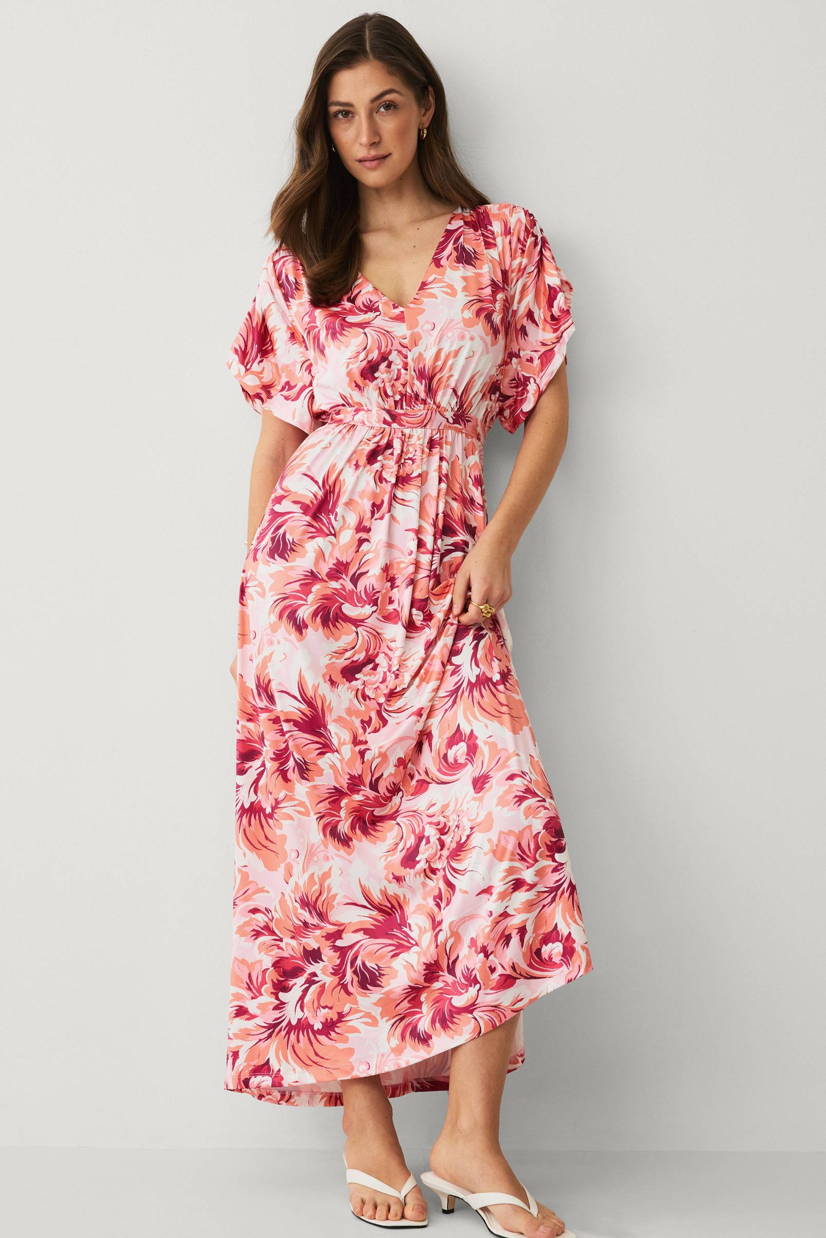 • Kleid aus recyceltem, weichem, elastischem Polyester• V-förmiger Ausschnitt• Dekorative Krawatte in der Taille• Ausgestellte Passform unten• Maxi-Länge• Kurzer Kimonoärmel mit Drapierung an den Schultern• Länge: 132 cm in Größe S