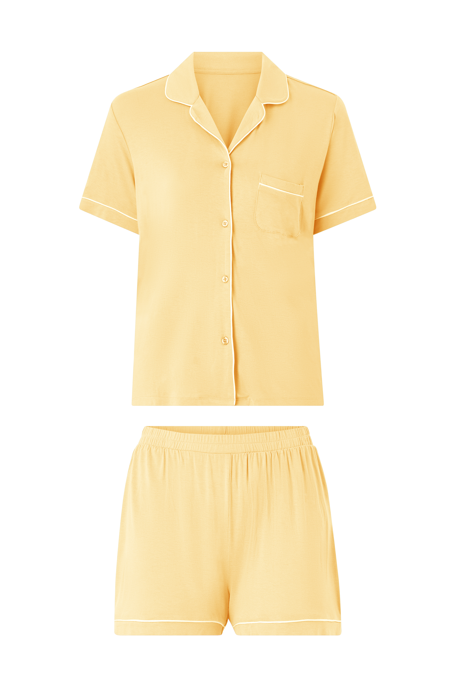• 2-teiliger Schlafanzug aus Viskosefasermix• Kurzärmliges Hemd mit Knopfverschluss und einer Brusttasche• Eine Shorts mit elastischer Taille• Kontrastfarbige Paspelkanten