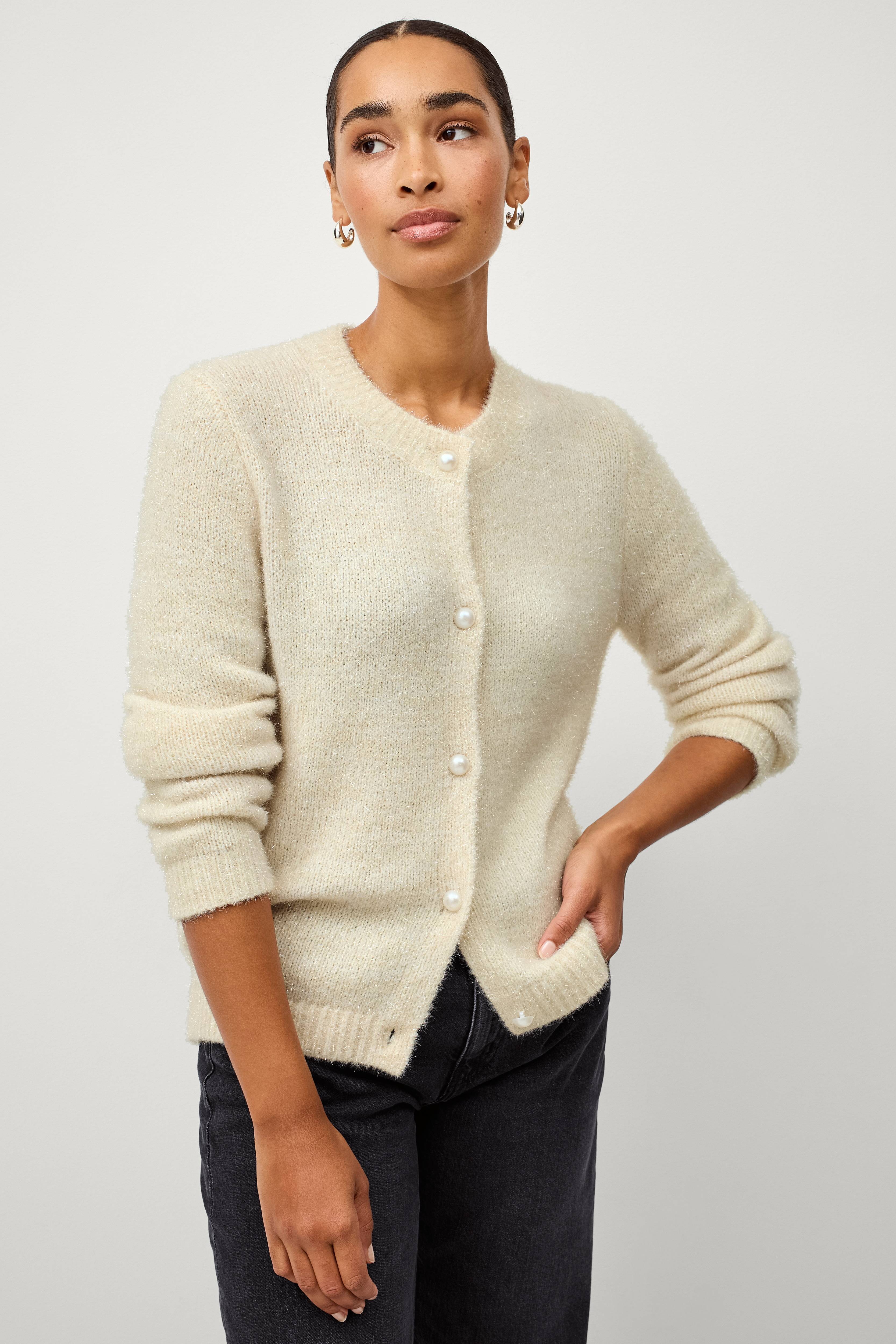 • Glänzendes Modell mit großen Perlenknöpfen vorne