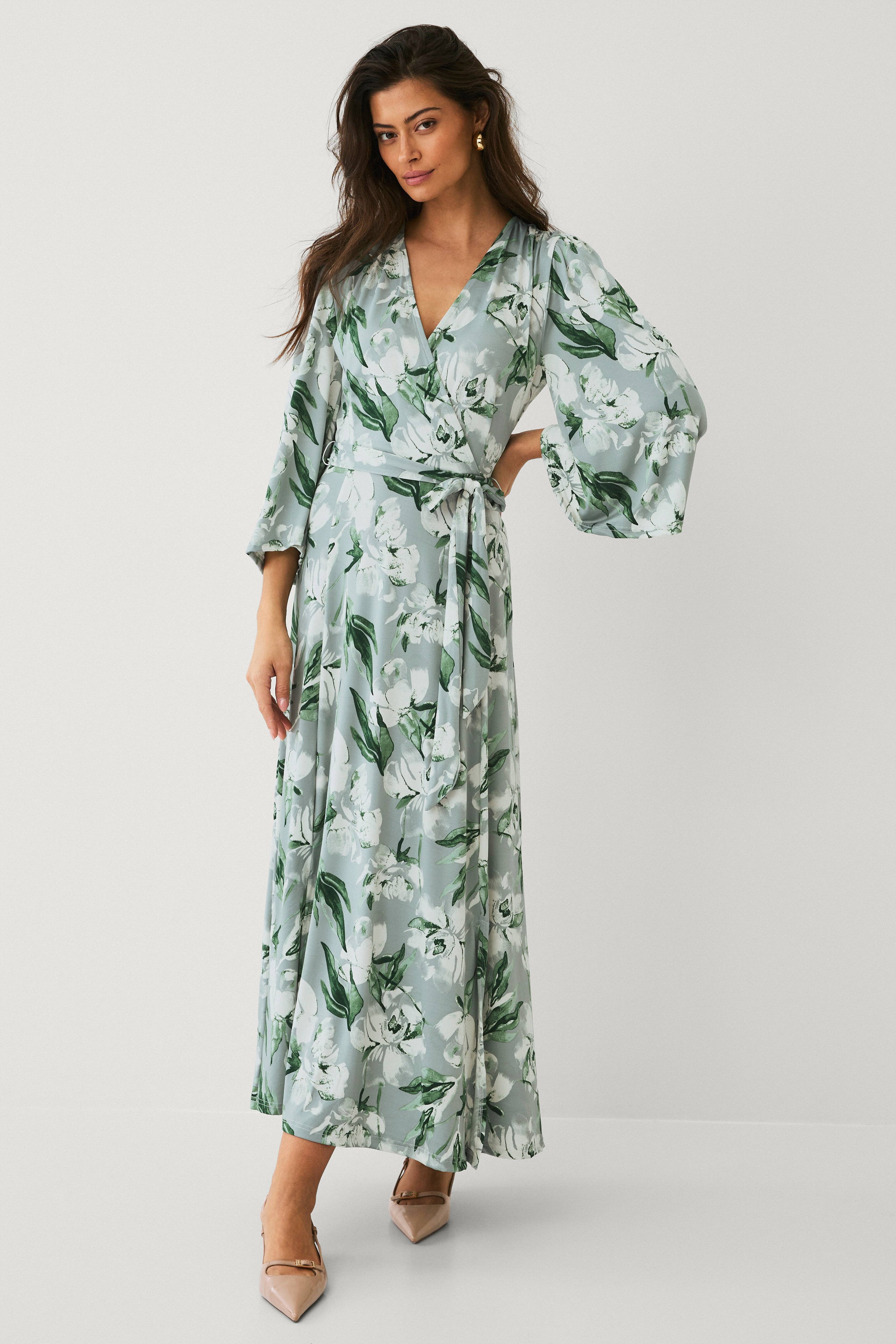 • Große Größen • Ausgestelltes Modell mit Gürtel zum selberbinden in der Taille • V-Ausschnitt mit Wrapper • 3/4-lange, ausgestellte Ärmel • Kräuselung an den Schultern • Länge: 138 cm in Größe 34/36