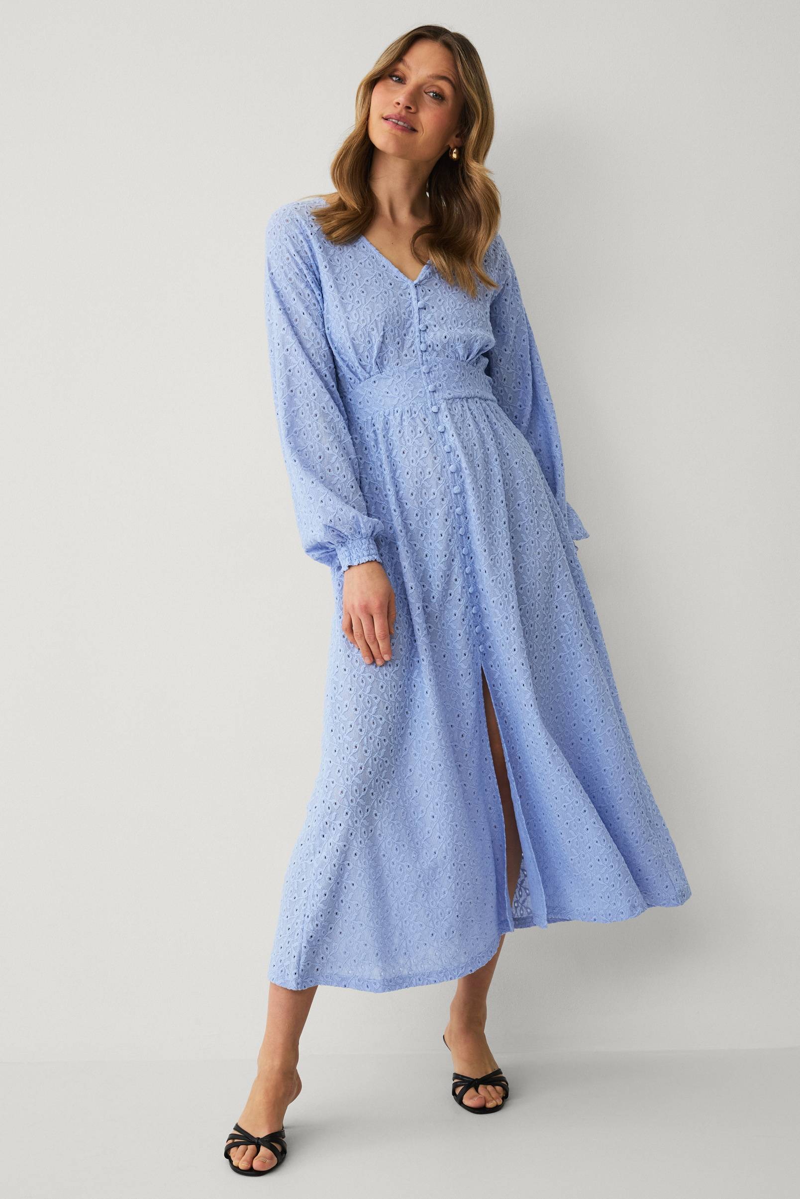 • Langes Kleid mit gesticktem Lochmuster• V-Ausschnitt• Überzogene Knöpfe vorne• Ballonärmel mit Smok an den Ärmelenden• Schlitz vorne• Gummiband an der hinteren Taille• Länge: 130 cm in Größe S