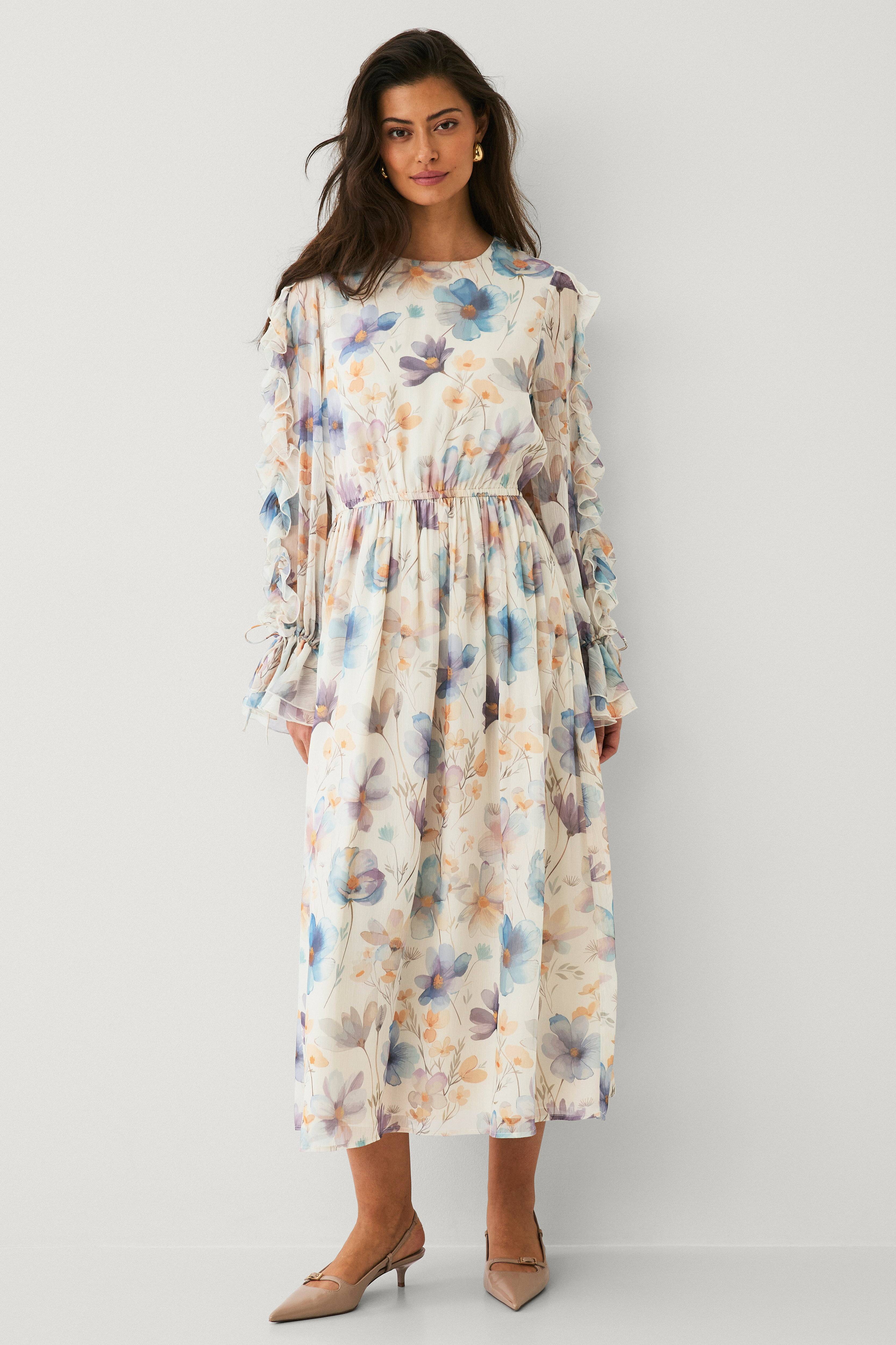 • Langes, ausgestelltes Modell aus Krepp-Chiffon • Rundhalsausschnitt mit Knopf am Hals • Langer Ärmel mit Rüschenröcken und einstellbarem Kordelzug unten • Definierte, elastische Taille • Gefüttert • Länge: 130 cm in Größe S