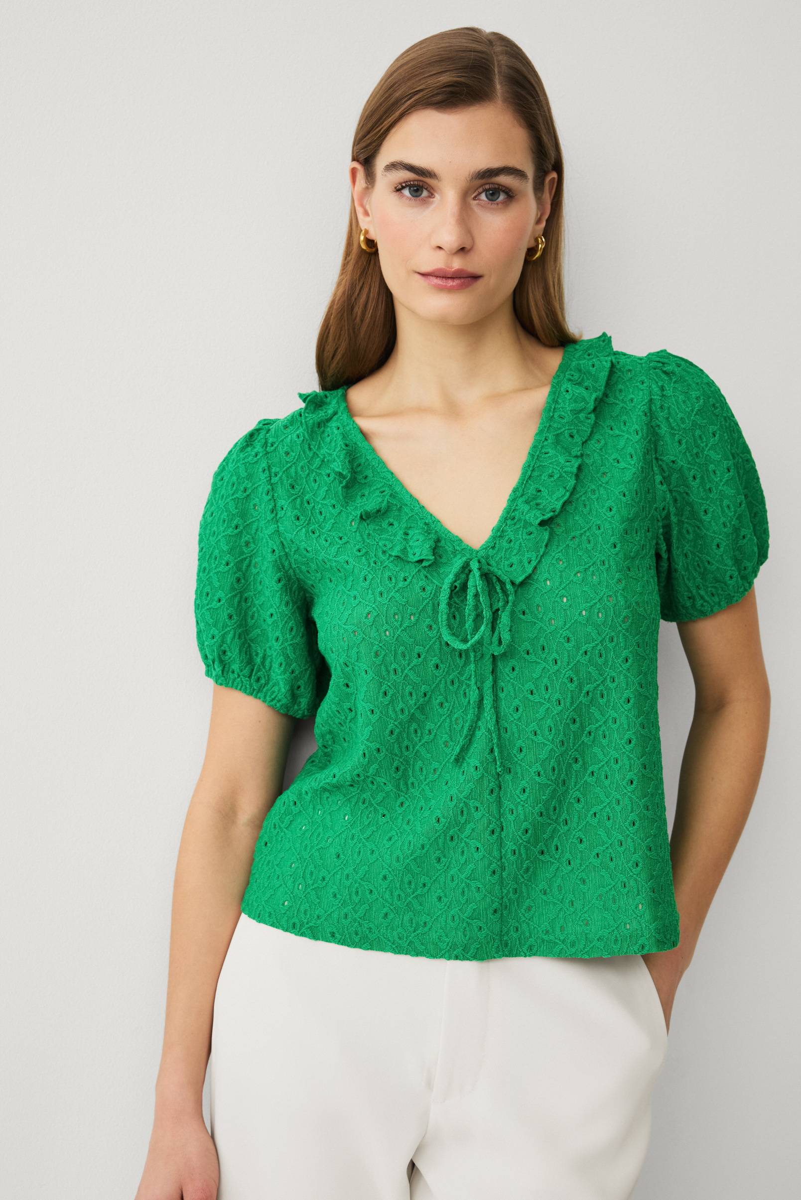 • Oberteil mit einem Loch-Muster und dekorativer Rüsche• V-Ausschnitt• Kurze Ballonärmel• Schleifen-Detail vorne• Normale Passform• Länge: 56 cm in Größe S