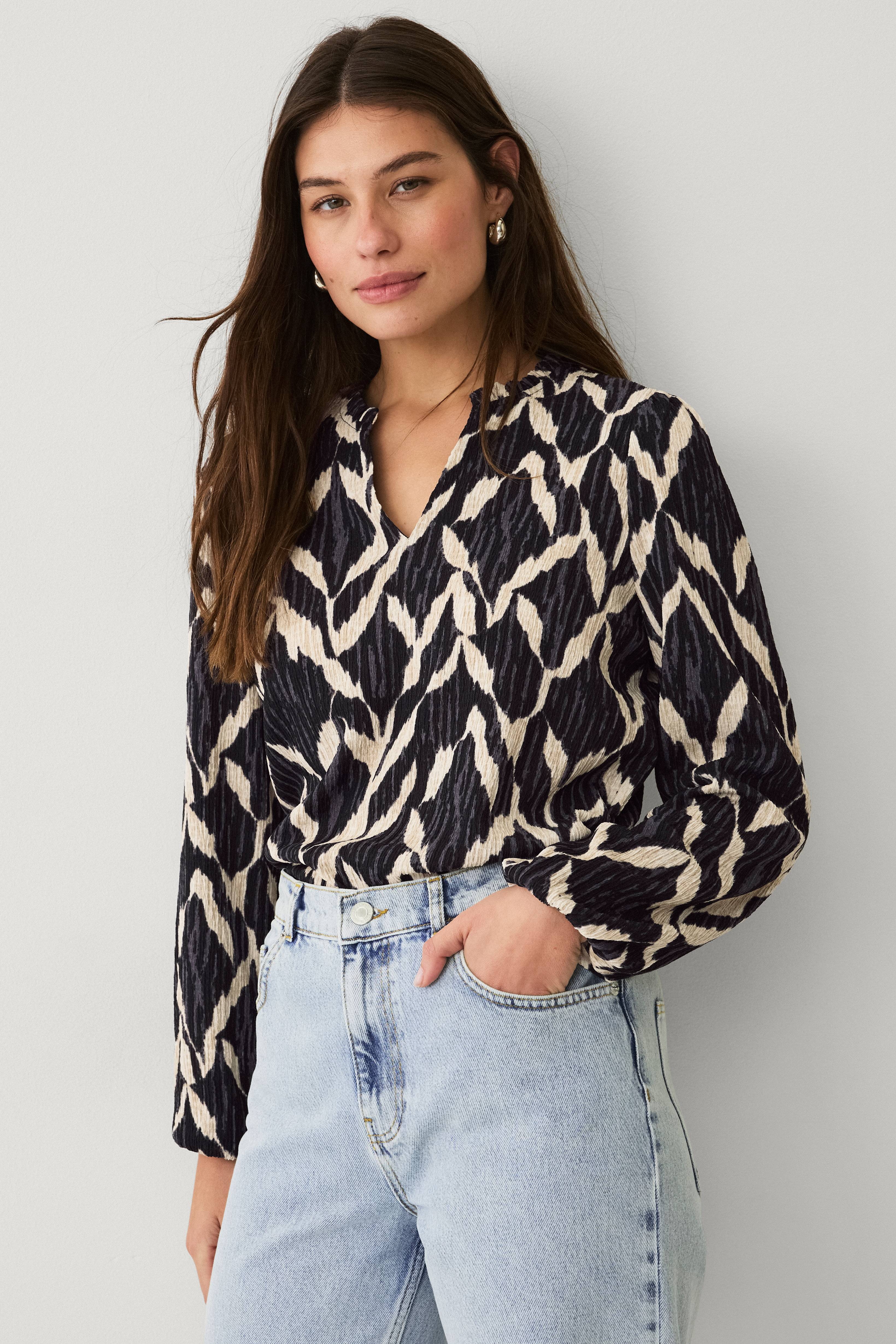• Gemustertes Oberteil• Elastischer Stoff mit leichter Struktur• V-förmiger Nacken• Rüschenkante um den Halsausschnitt• Lange Ärmel mit Gummiband an den Bündchen• Länge: 59 cm in Größe S