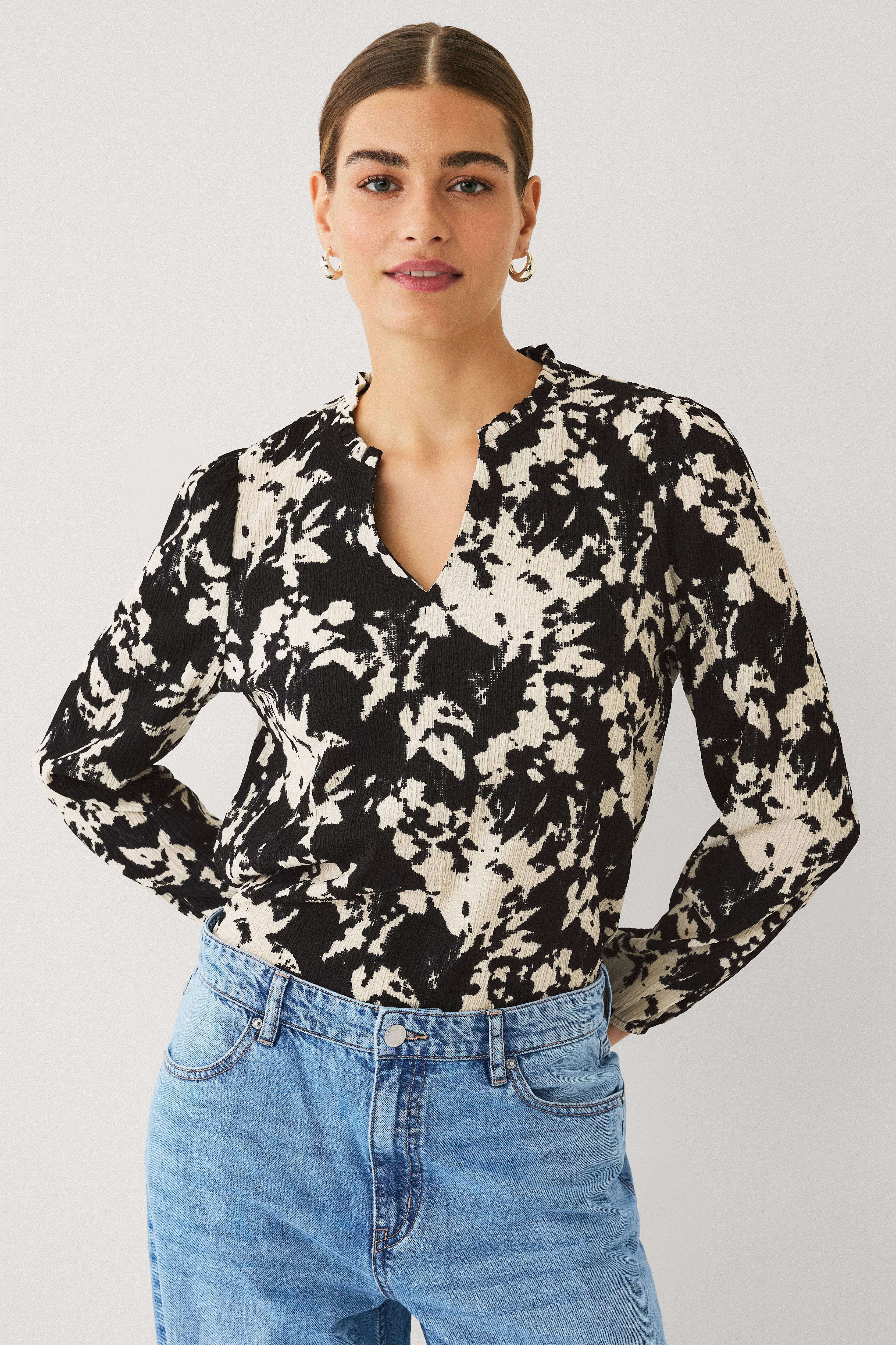 • Gemustertes Oberteil• Elastischer Stoff mit leichter Struktur• V-förmiger Nacken• Rüschenkante um den Halsausschnitt• Lange Ärmel mit Gummiband an den Bündchen• Länge: 59 cm in Größe S