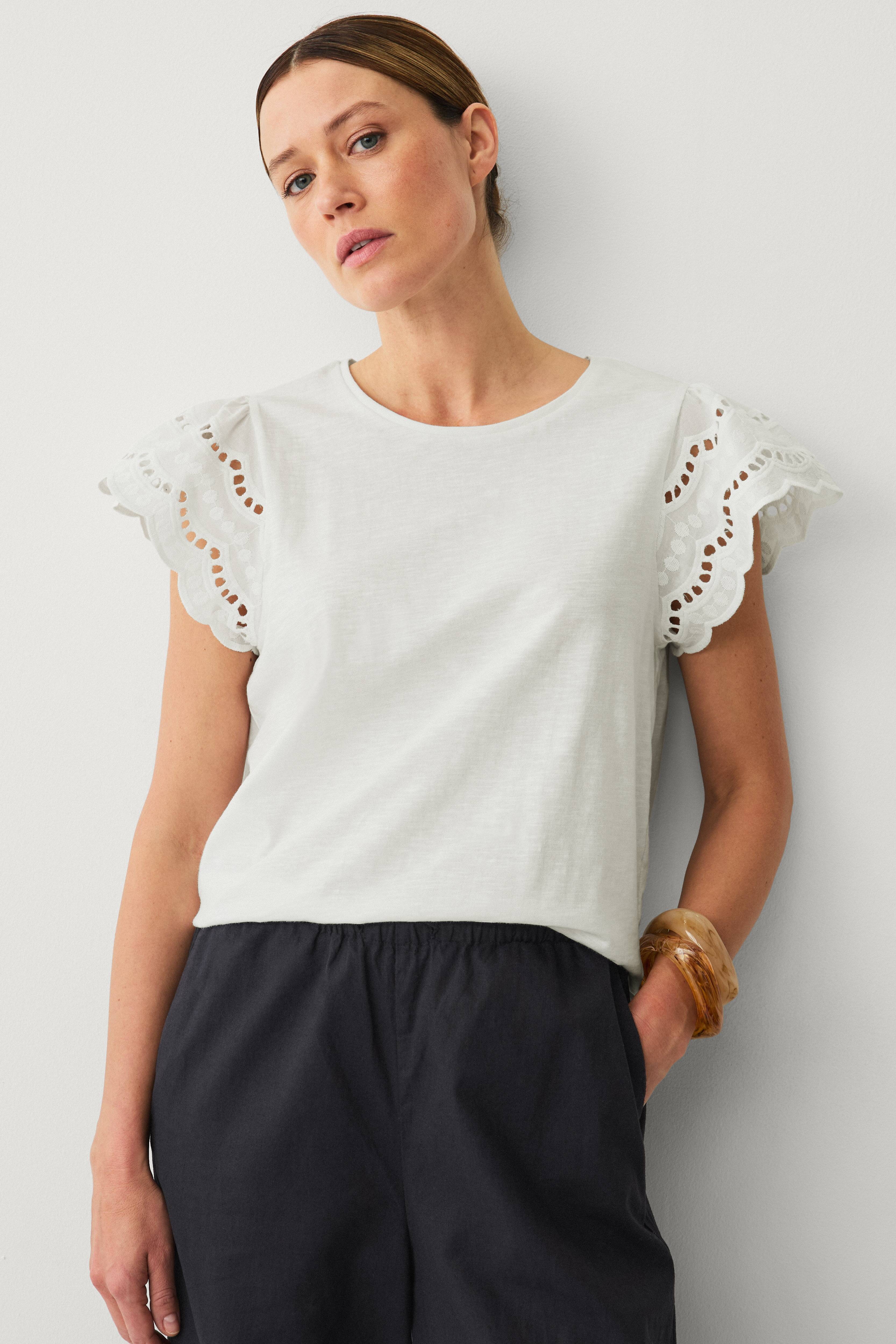 • Modell aus Jersey• Rundhalsausschnitt• Kurzer, breiter Ballonärmel mit Lochstickereien• Länge: 57 cm in Größe S