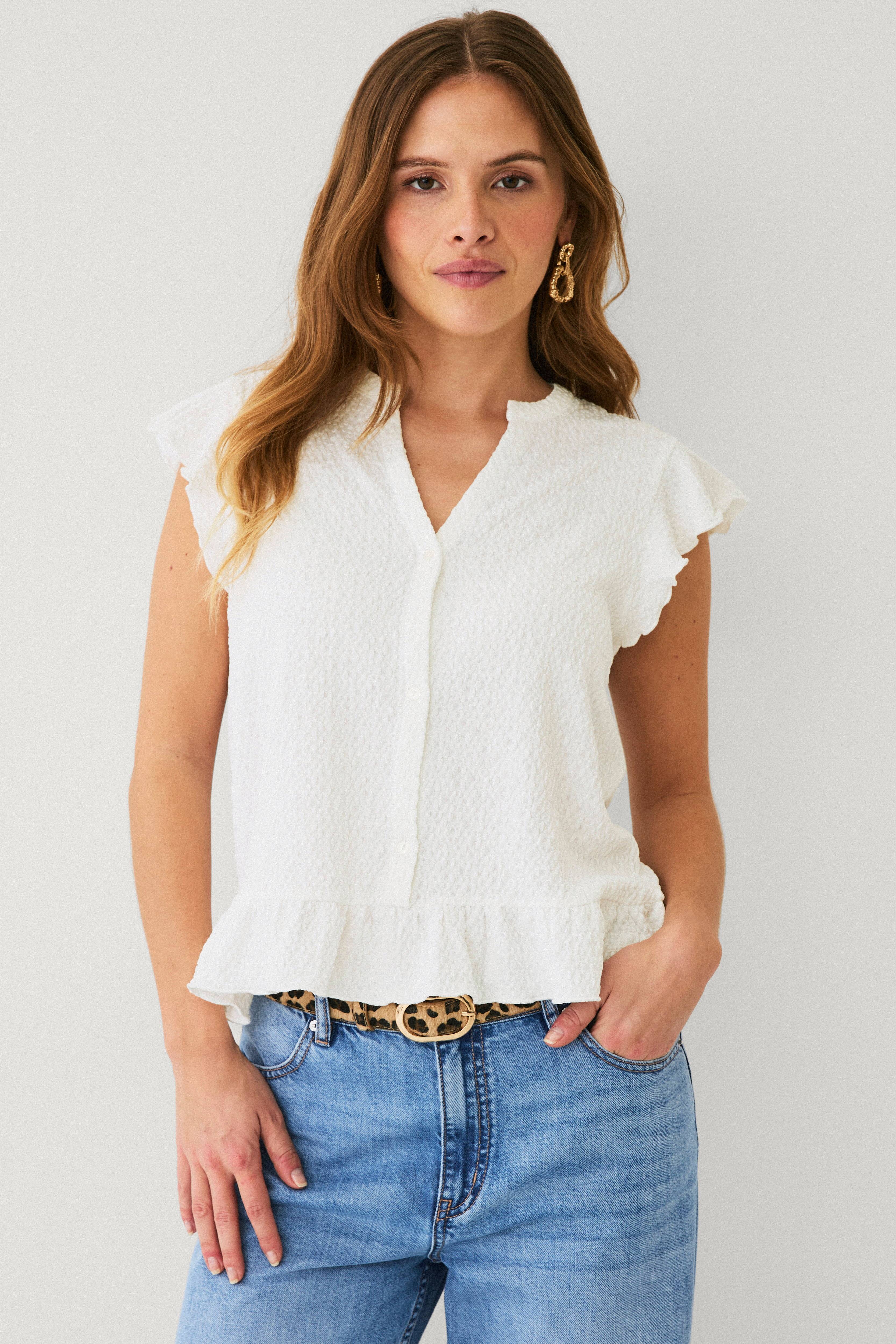 • Oberteil aus weichem Polyester-Mix mit Strukturmuster • Knopfleiste vorne mit dekorativen Knöpfen • V-förmiger Ausschnitt • Kurze Volantärmel • Rüschen-Design unten • Länge: 58 cm in Größe S