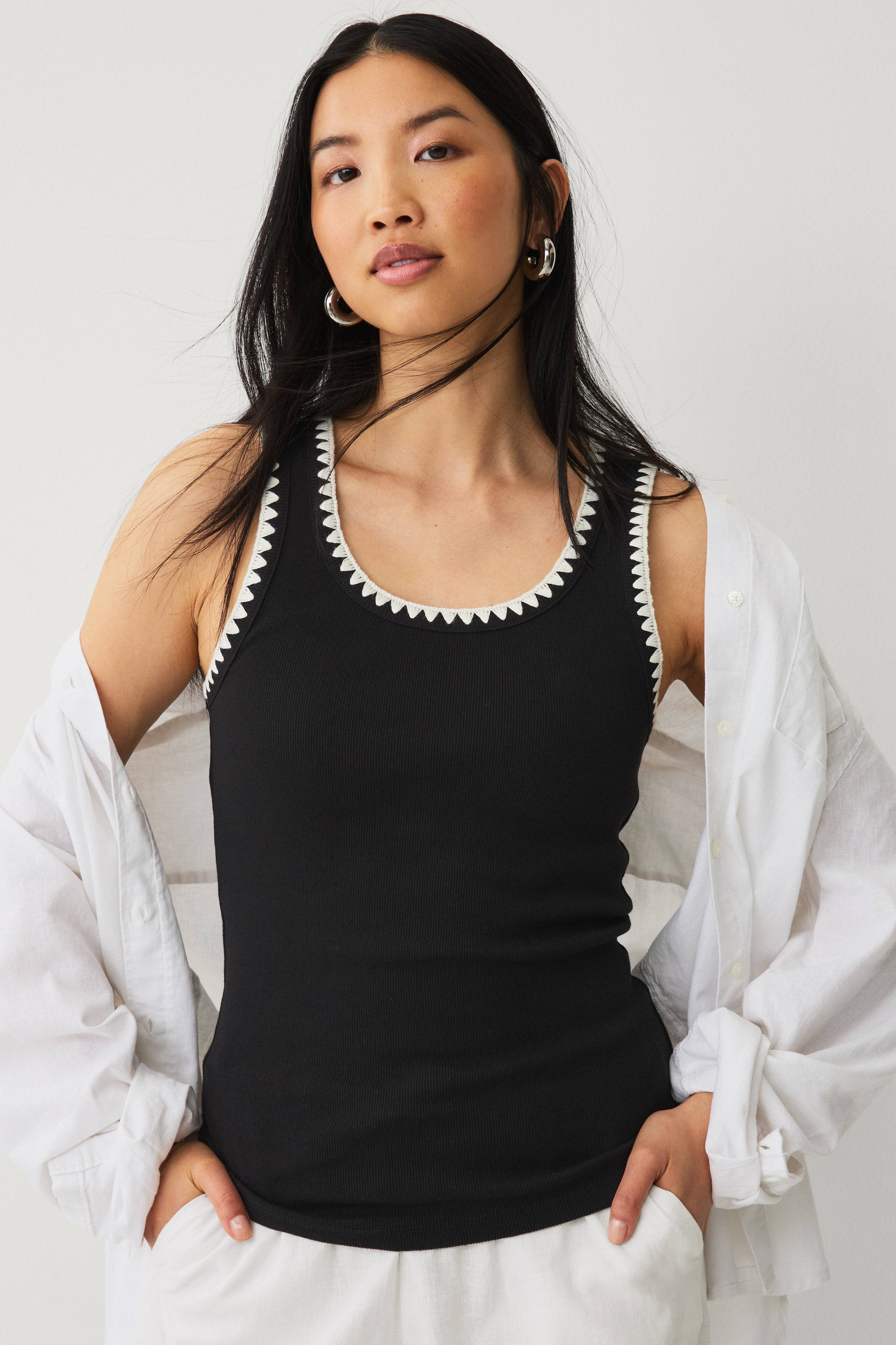 • Ärmelloses Modell im Rippenstrick