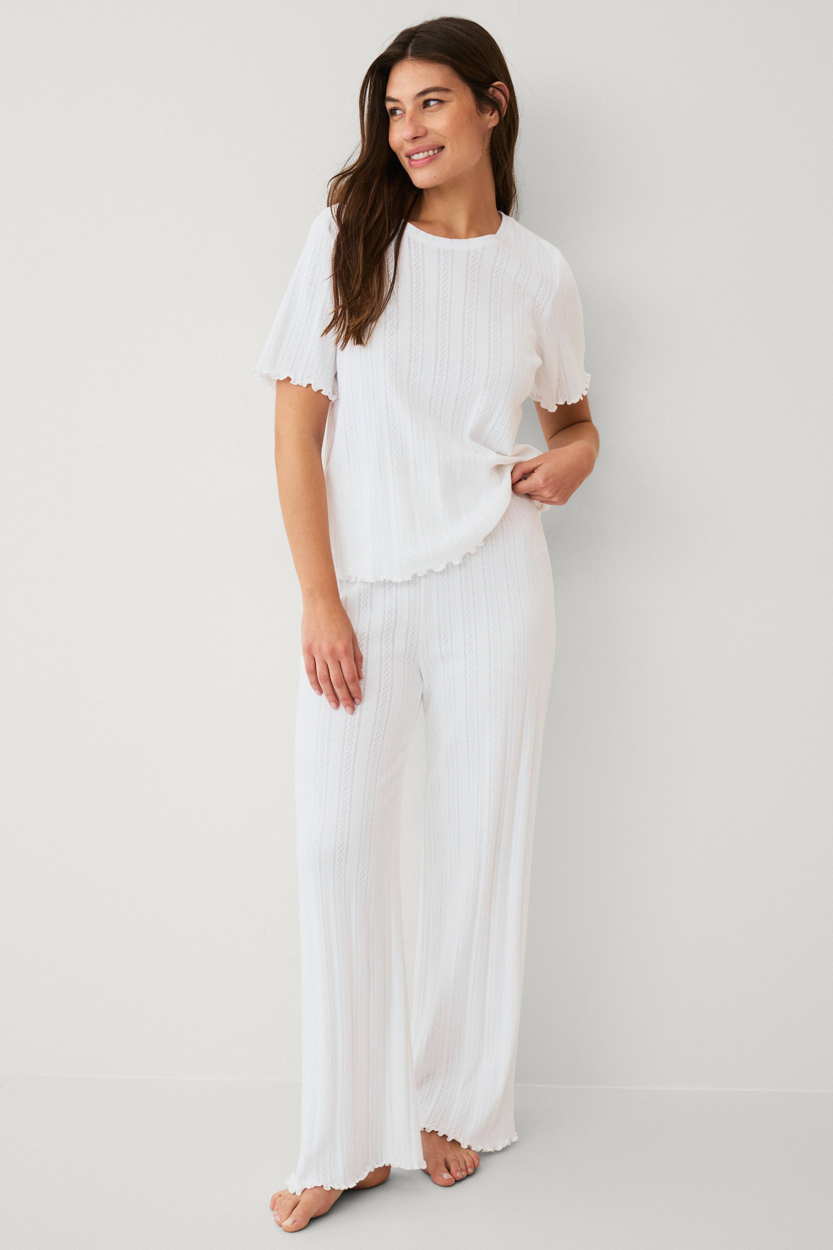 • 2-teiliger Schlafanzug mit T-Shirt und Hose• Elastischer Bund• Welliger Rand an den Bündchen, unten, in der Taille und um die Beinöffnungen• Aus weichem, elastischem Trikot mit Lochmuster hergestellt