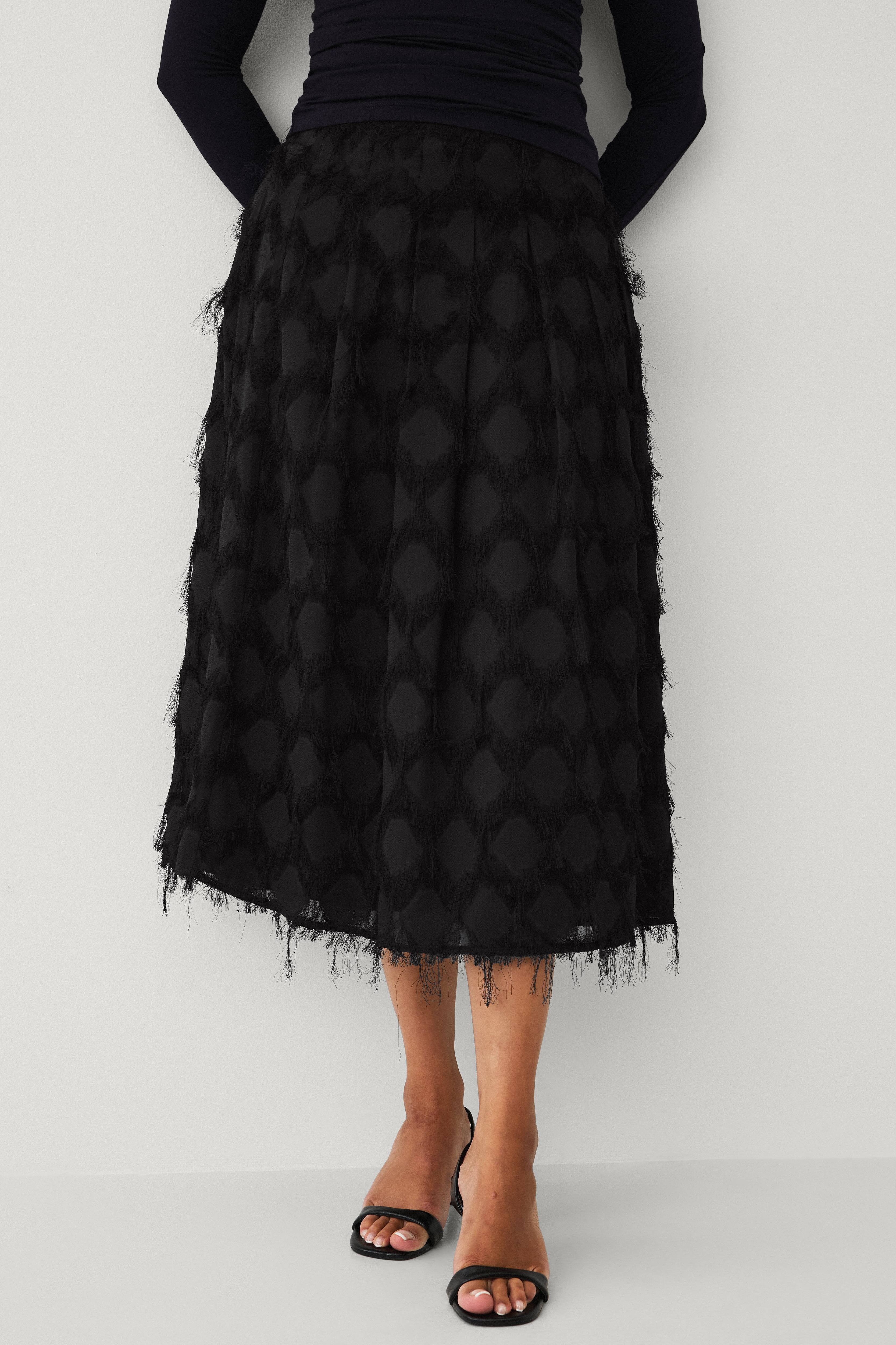 • Hohe Taille• Versteckter Reißverschluss an einer Seite• Gequetschte Details vorne und hinten• Fransen-Details komplett• Textilfutter• Normale Passform• Länge: 91 cm in Größe 36