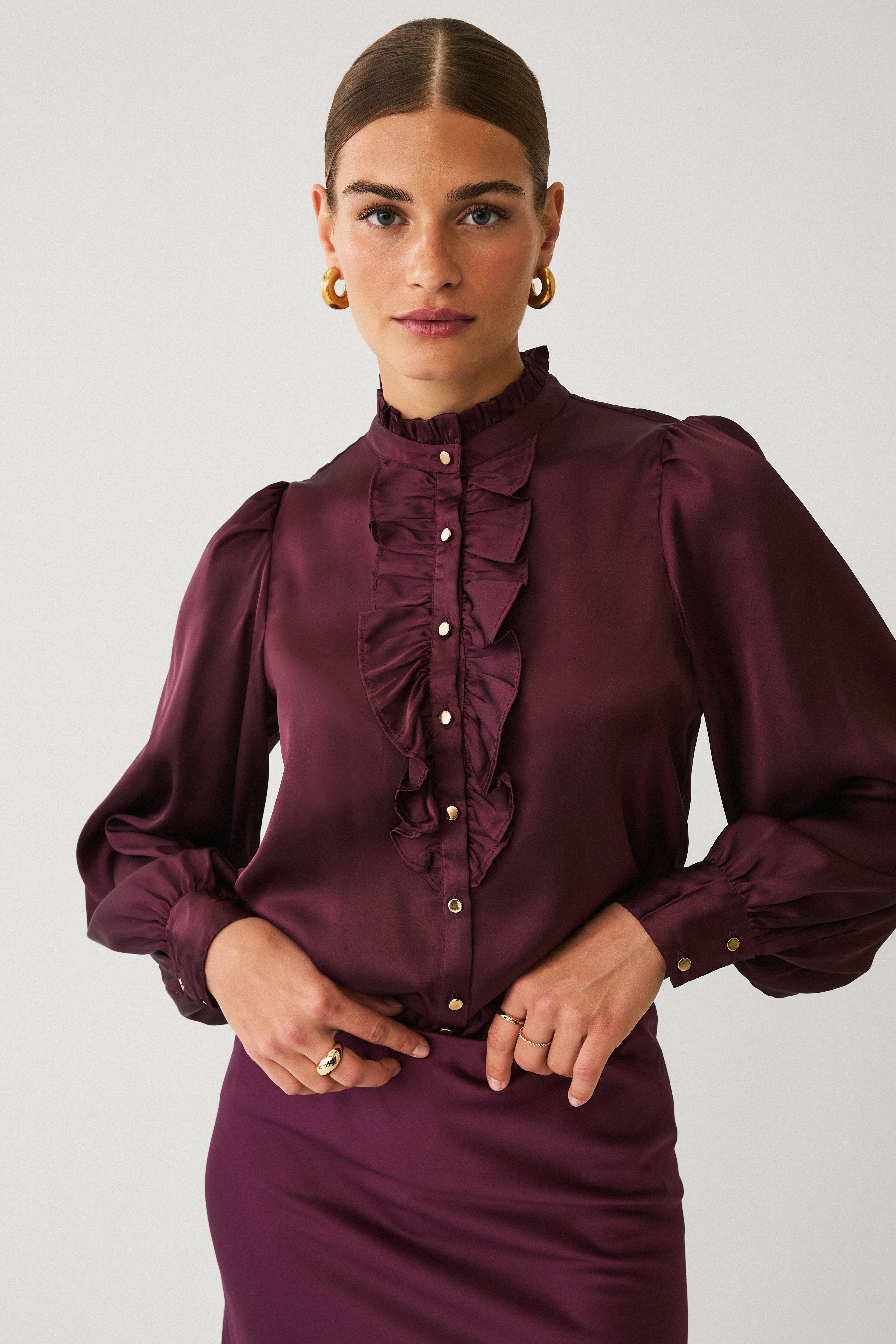 • Schimmernde Bluse aus Satin• Stehkragen• Rüsche• Lange Puffärmel• Bündchen an den Armenden• Knopfverschluss• Normale Passform• Länge: 64 cm in Größe S