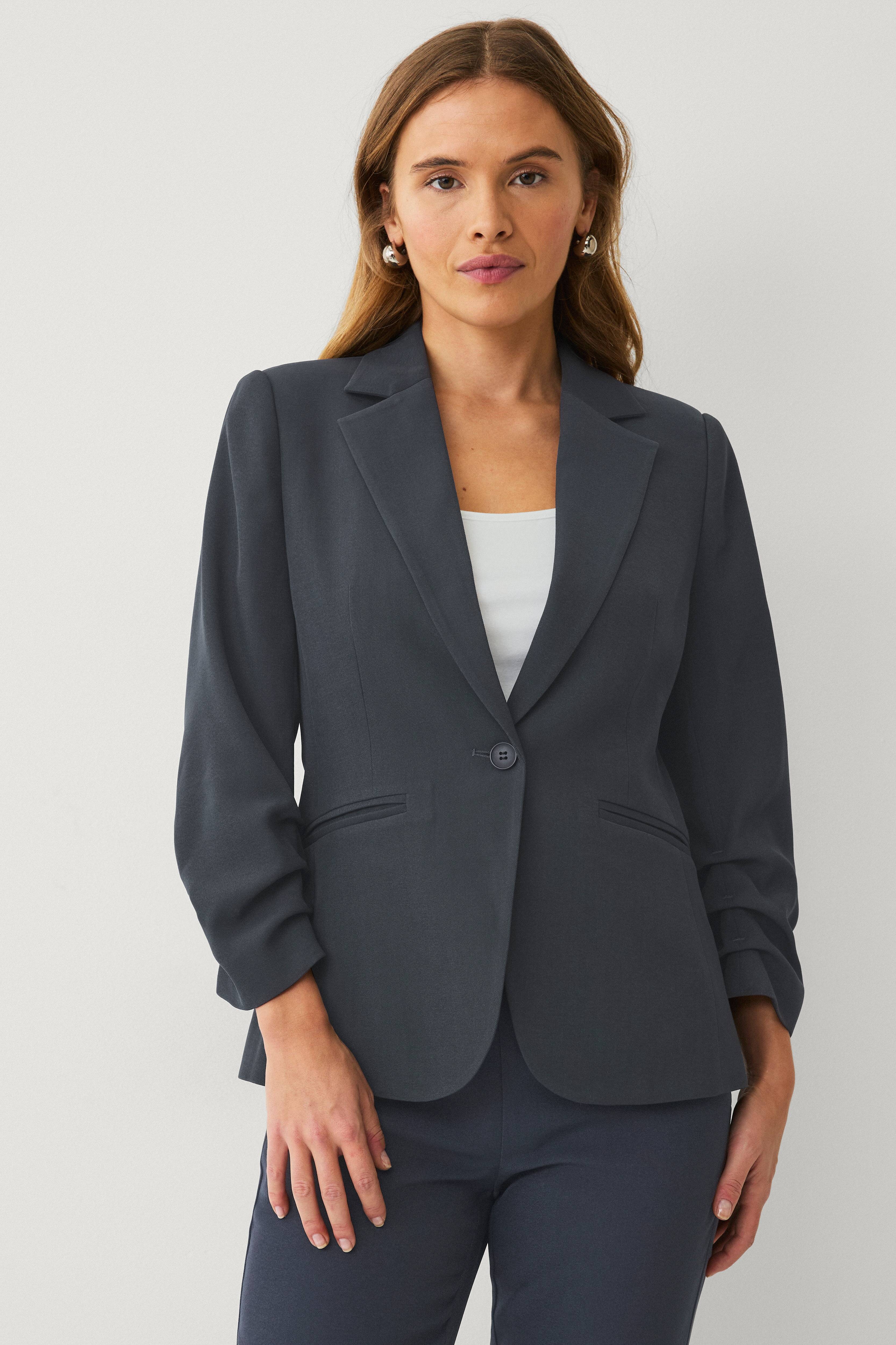 • Große Größen• Modell mit Kragen und Revers• Ein Knopf vorne• Leistentaschen• Schulterpolster• Ärmel mit Drapierfalten unten• Gefüttert• Länge: 65 cm in Größe 36