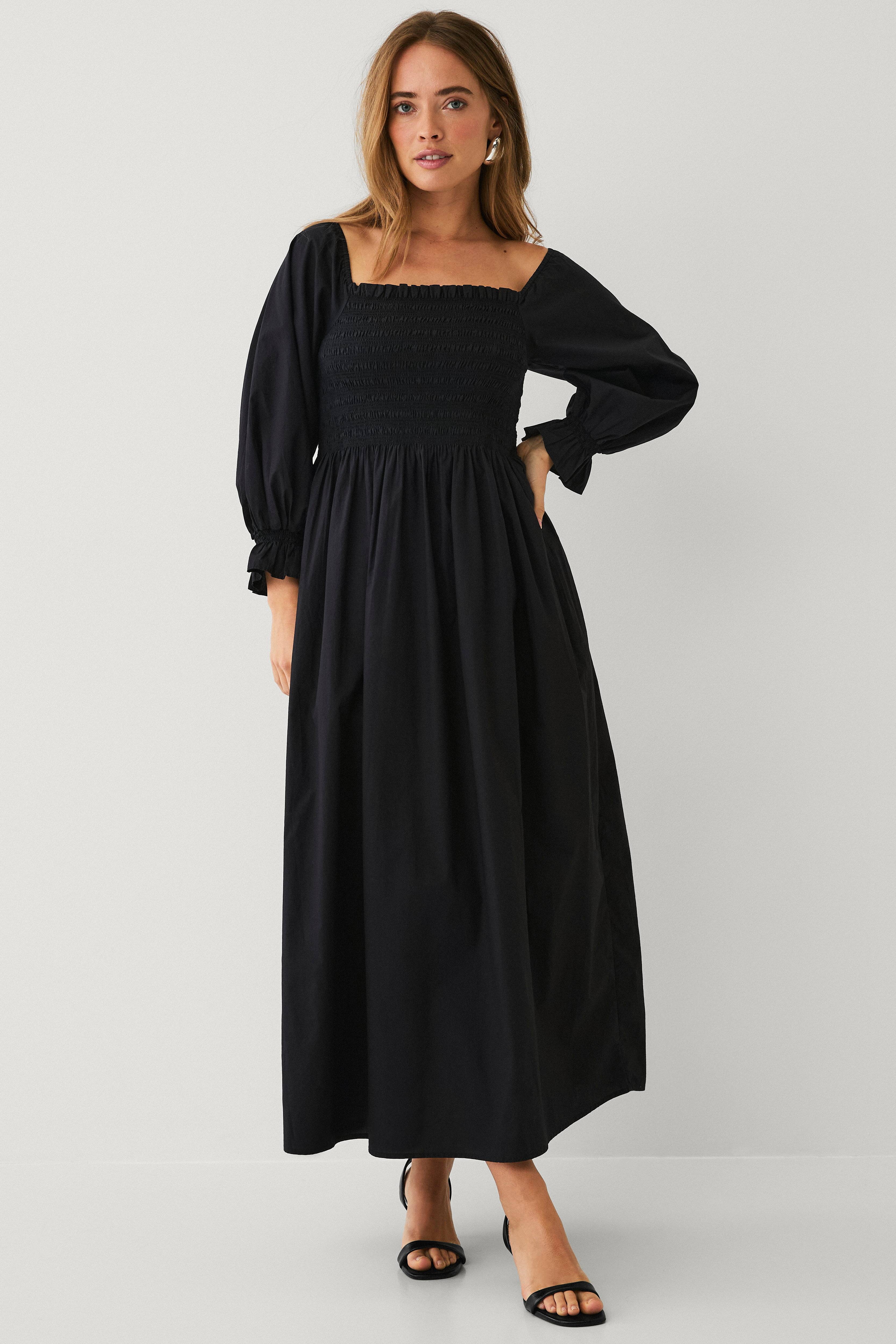 • Ausgestelltes Maxikleid mit elastischem Smoking auf der Oberseite • Eckiger Nacken mit Rüschenrock vorne und hinten und innerem Gummiband über den Schultern • Breiter, 3/4-langer Ärmel im Raglanschnitt mit elastischen Nähten unten • Länge: 130 cm in Größe S