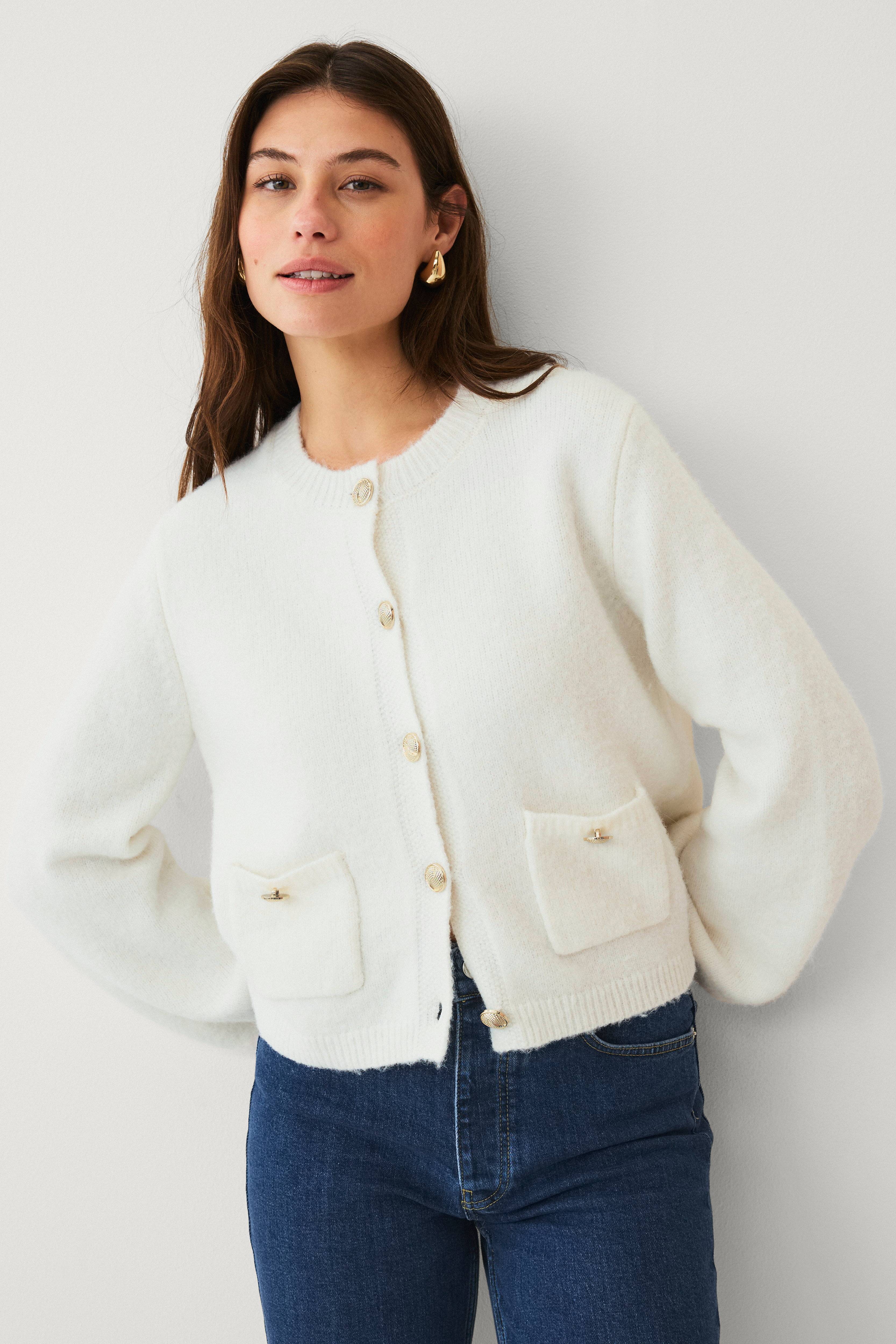 Schöne gestrickte Strickjacke mit goldenen Knöpfen. Warm und gemütlich.
