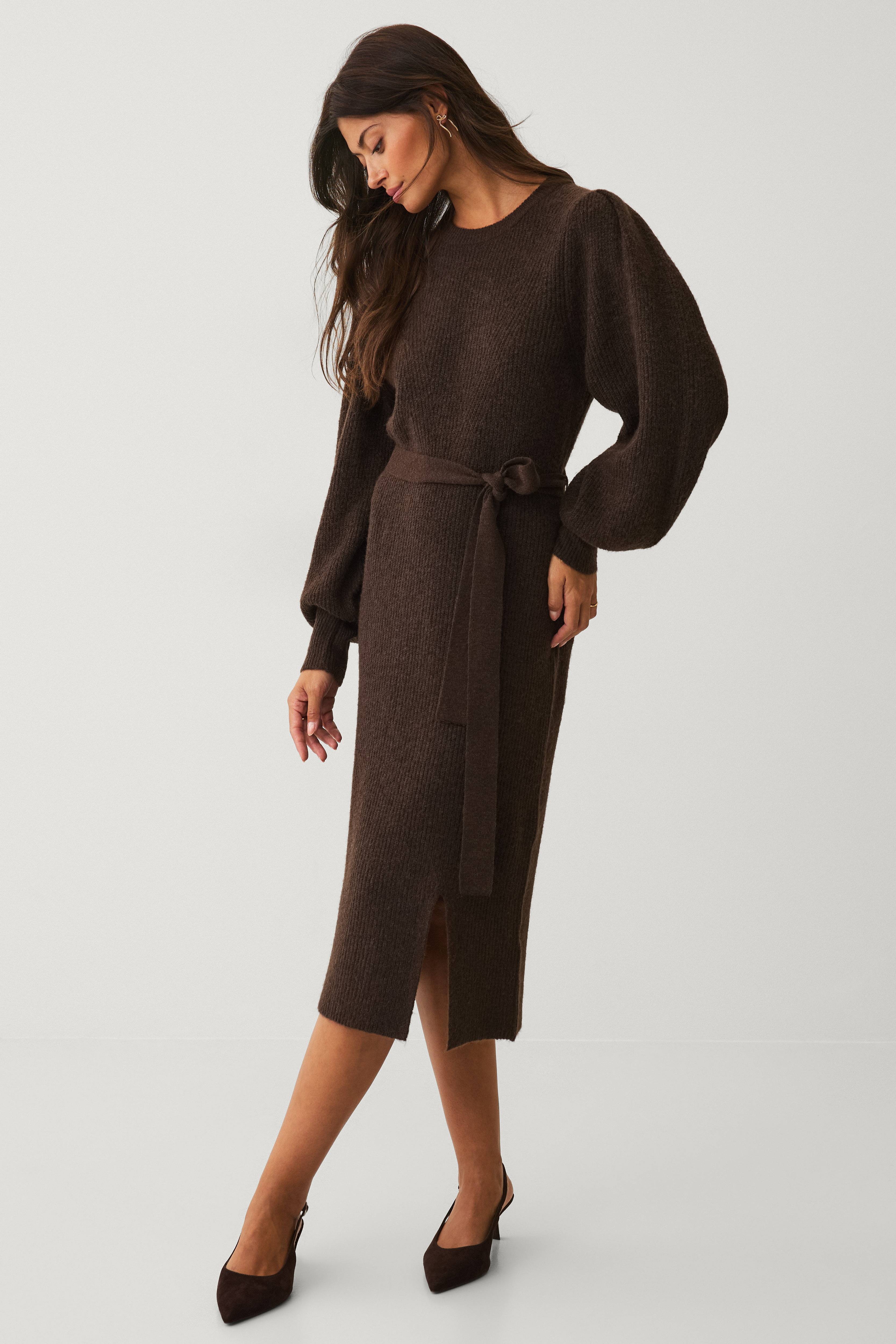 • Weiches, elastisches Strickkleid • Runder Ausschnitt • Lange Ballonärmel • Abnehmbarer Gürtel zum selberbinden in der Taille • Schlitz unten an der Vorderseite • Normale Passform • Länge: 112 cm in Größe S