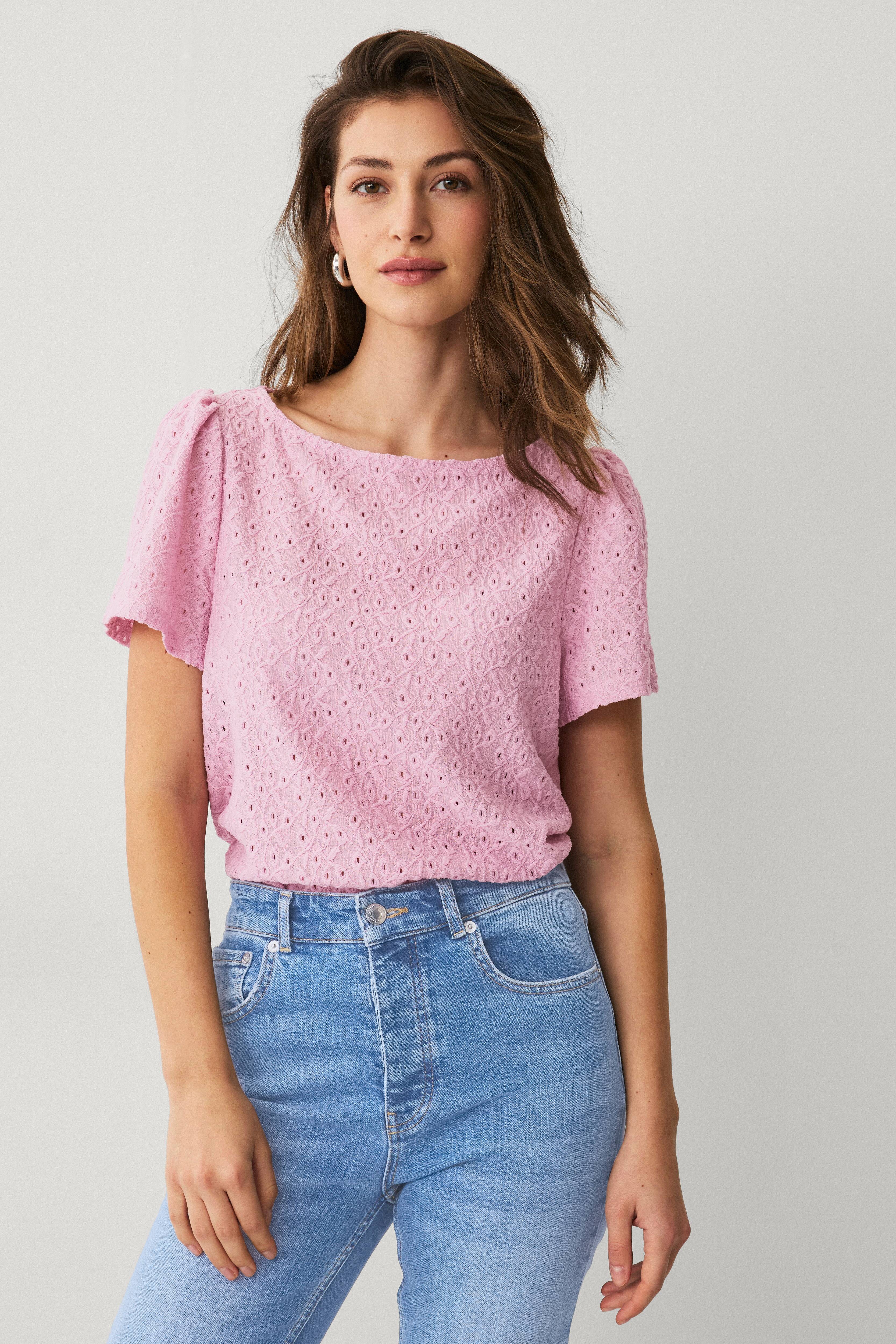 • Oberteil aus dünnem Material mit gewebter Struktur und Lochmuster• Runder, breiter Ausschnitt• Kurze Puffärmel• Gerade Passform• Länge: 57 cm in Größe S