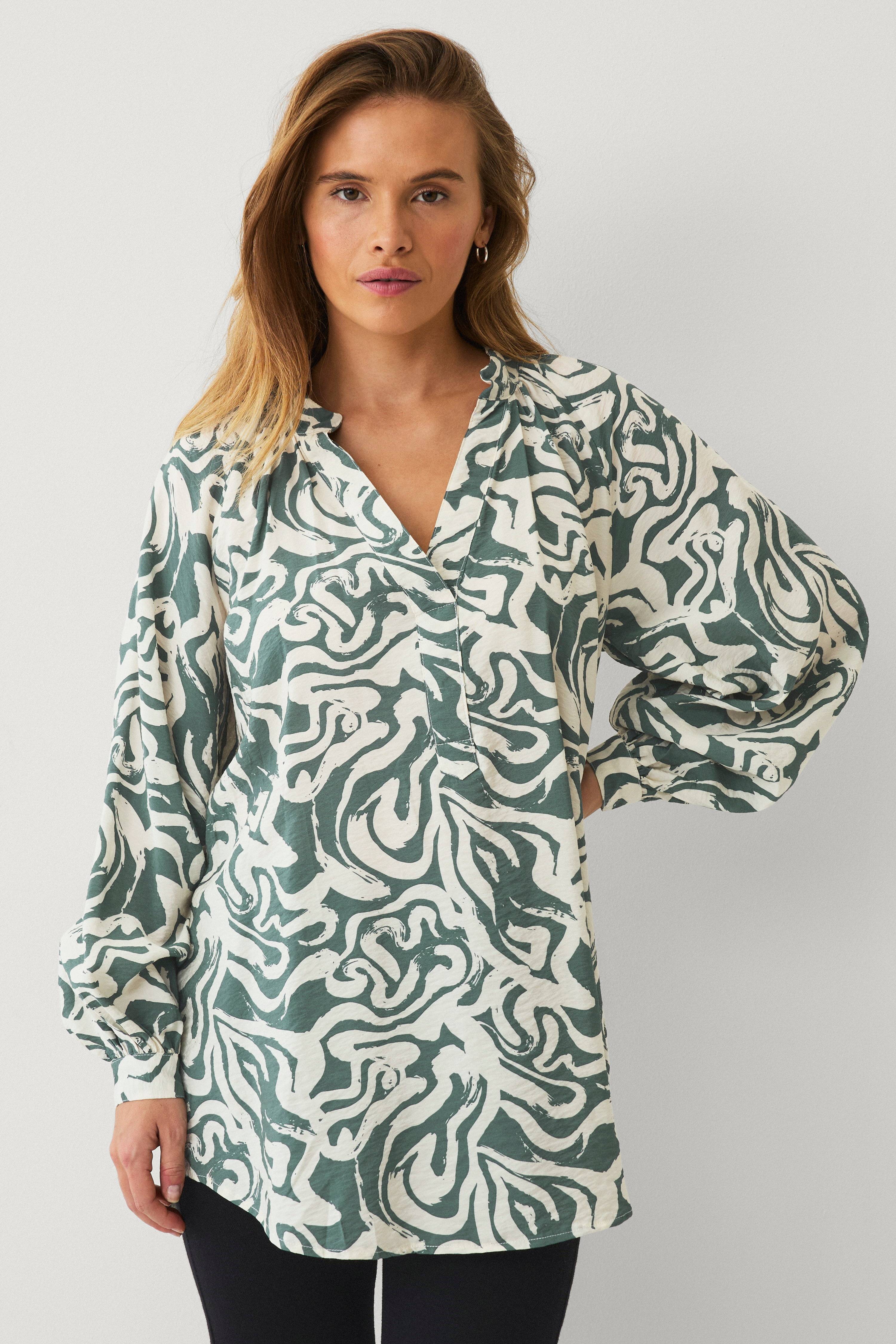 Schöne Bluse mit leicht gepufften Ärmeln, hübsches Muster, bin zufrieden mit dem Kauf. Fällt groß aus, hätte eine Größe kleiner nehmen können.