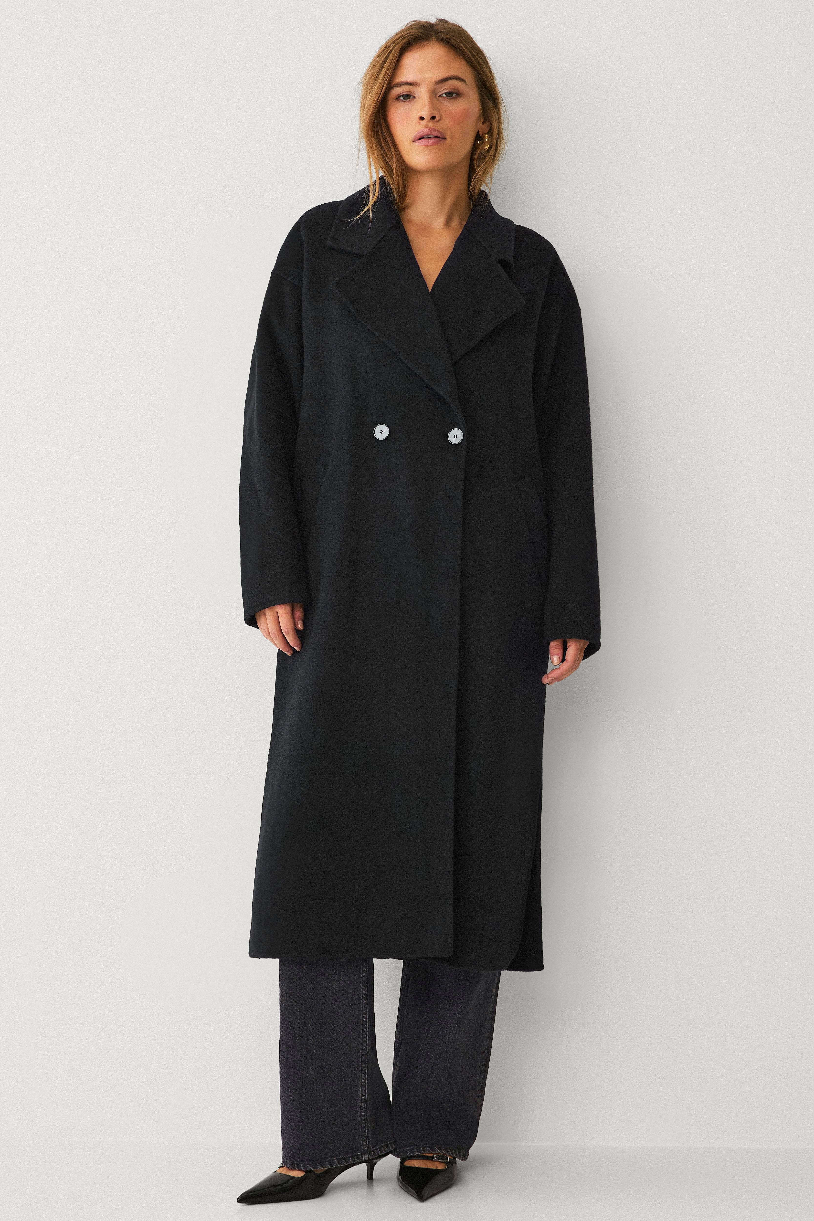 • Große Größen • Hohes Material aus Wollmischung • Oversize-Passform • Zwei Taschen • Schlitze unten an den Seiten • Gewebtes Futter • Länge: 123 cm in Größe S • Handgefertigte Säume ohne sichtbare Nähte