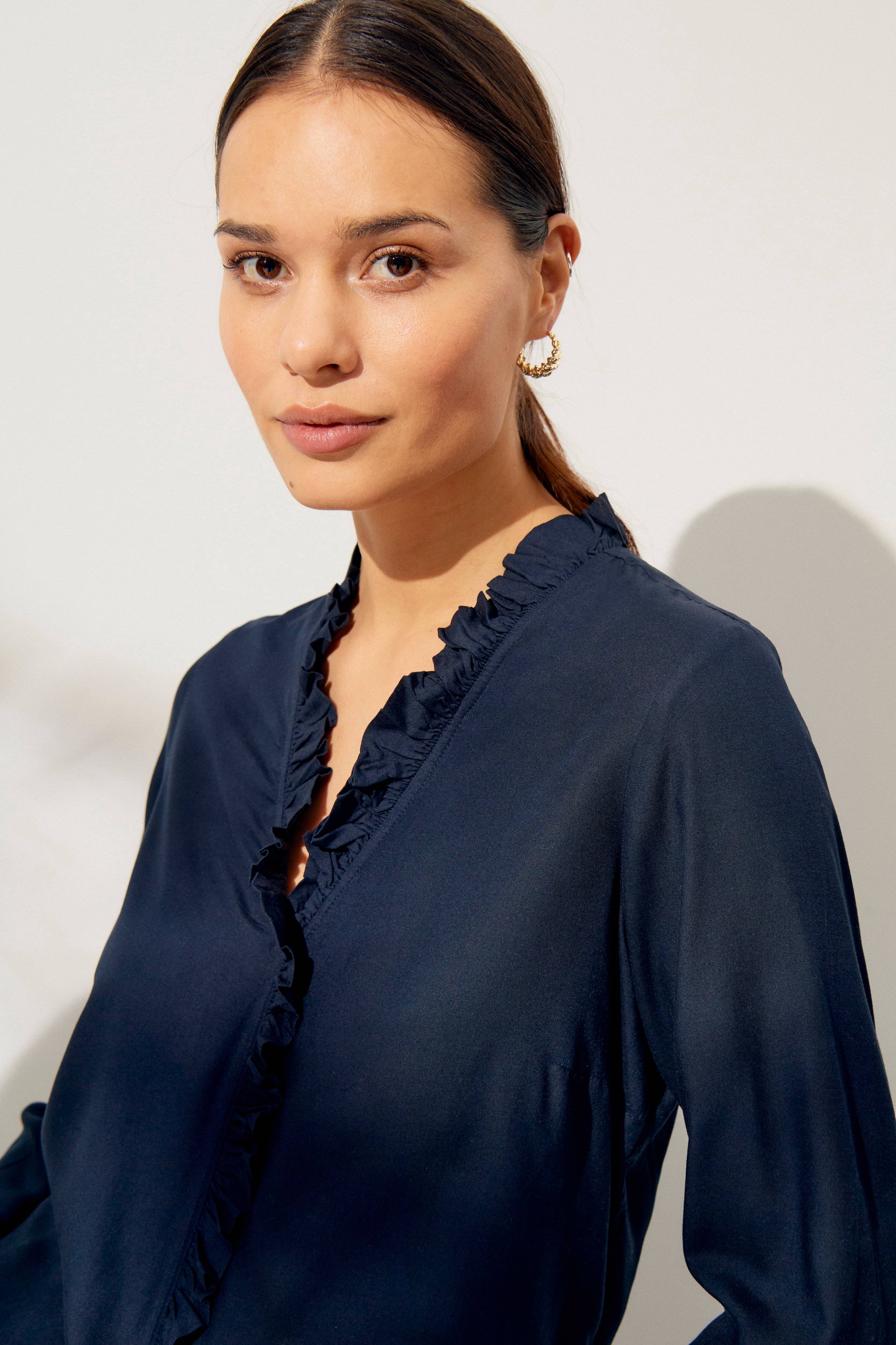 • V-förmiger Nacken mit kleiner Rüsche und Rüsche ganz vorne