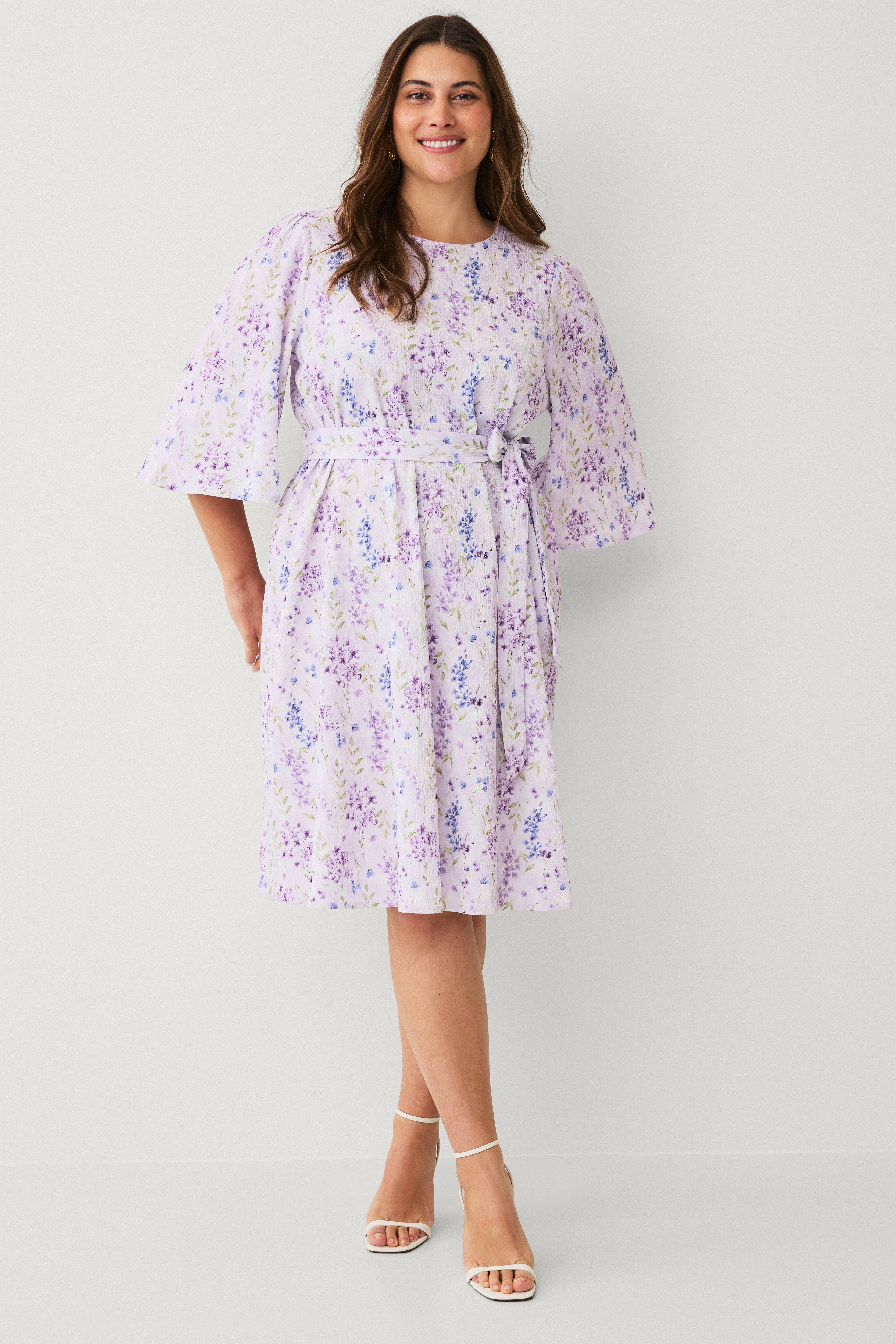 • Große Größen• Ausgestelltes Modell aus Krepp• Rundhalsausschnitt mit Knopf am Hals• Breiter, ausgestellter Ballonärmel• Gürtel zum selberbinden• Länge: 110 cm in Größe XL