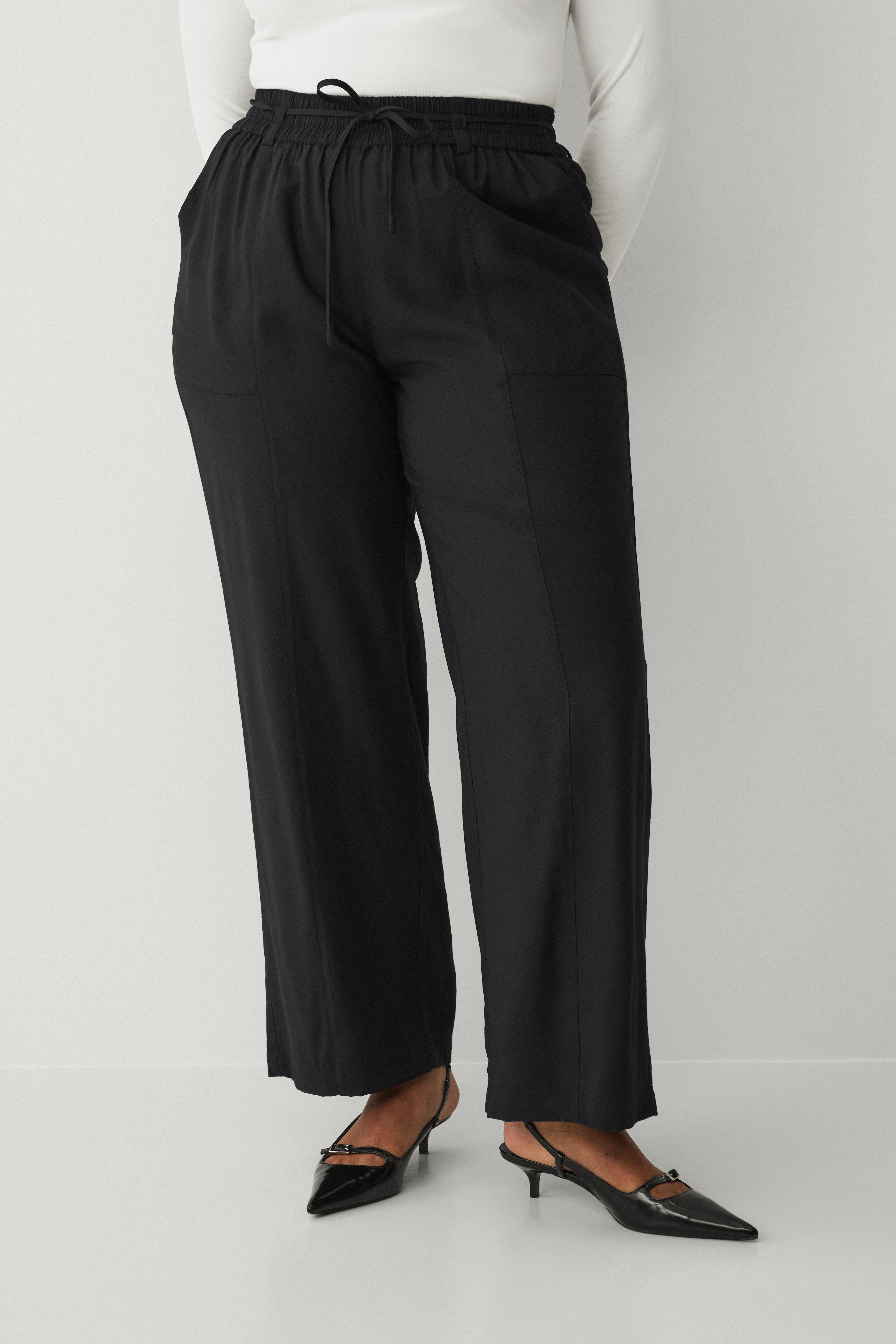 • Hose aus weichem, gewebtem Polyester-Gemisch mit breitem Hosenbein