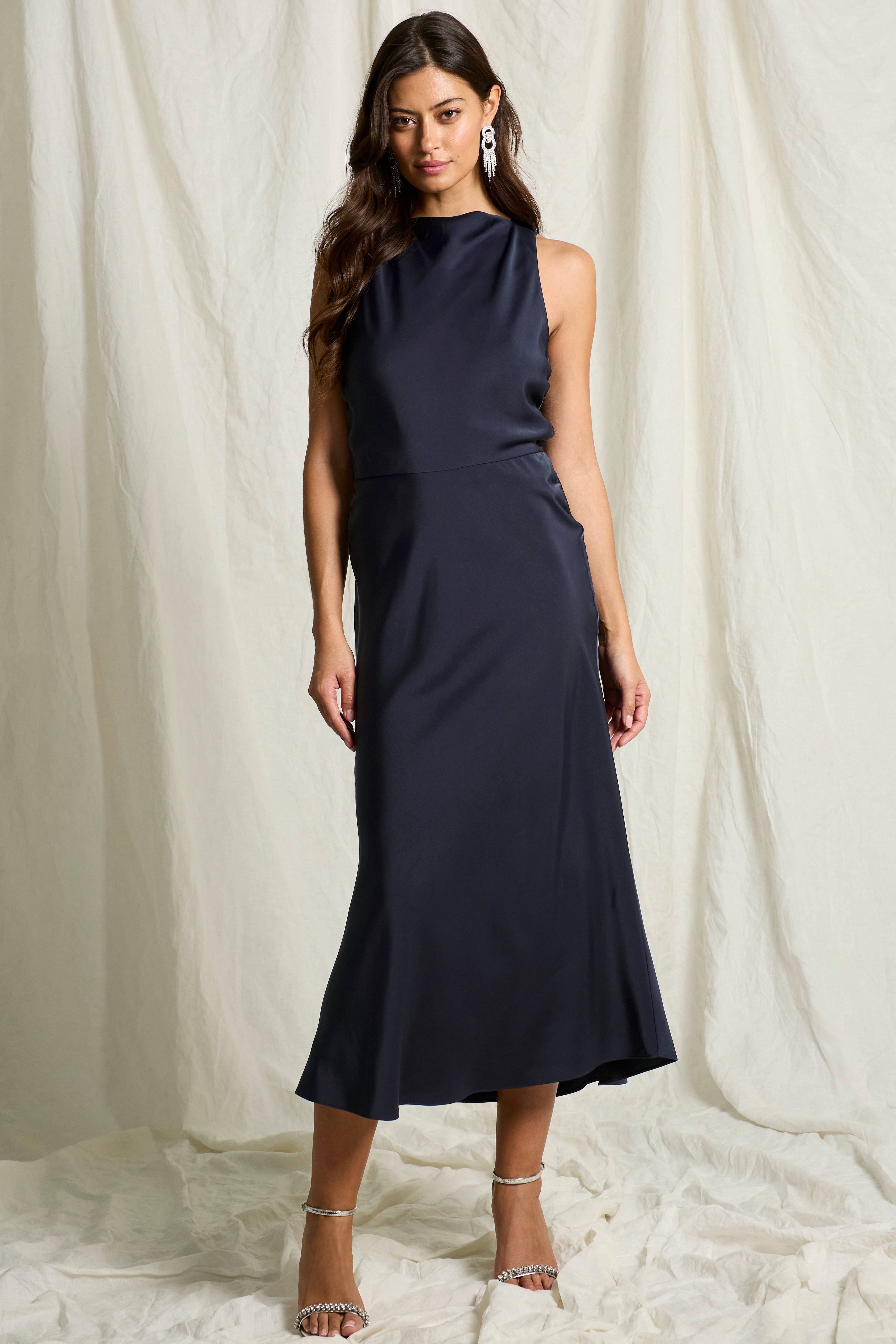 • Kleid aus Satin • Hochgeschlossener Ausschnitt • Gesammelte Drapierung in den Seiten • Versteckter Reißverschluss am Rücken • Gefüttert • Länge: 131 cm in Größe 36