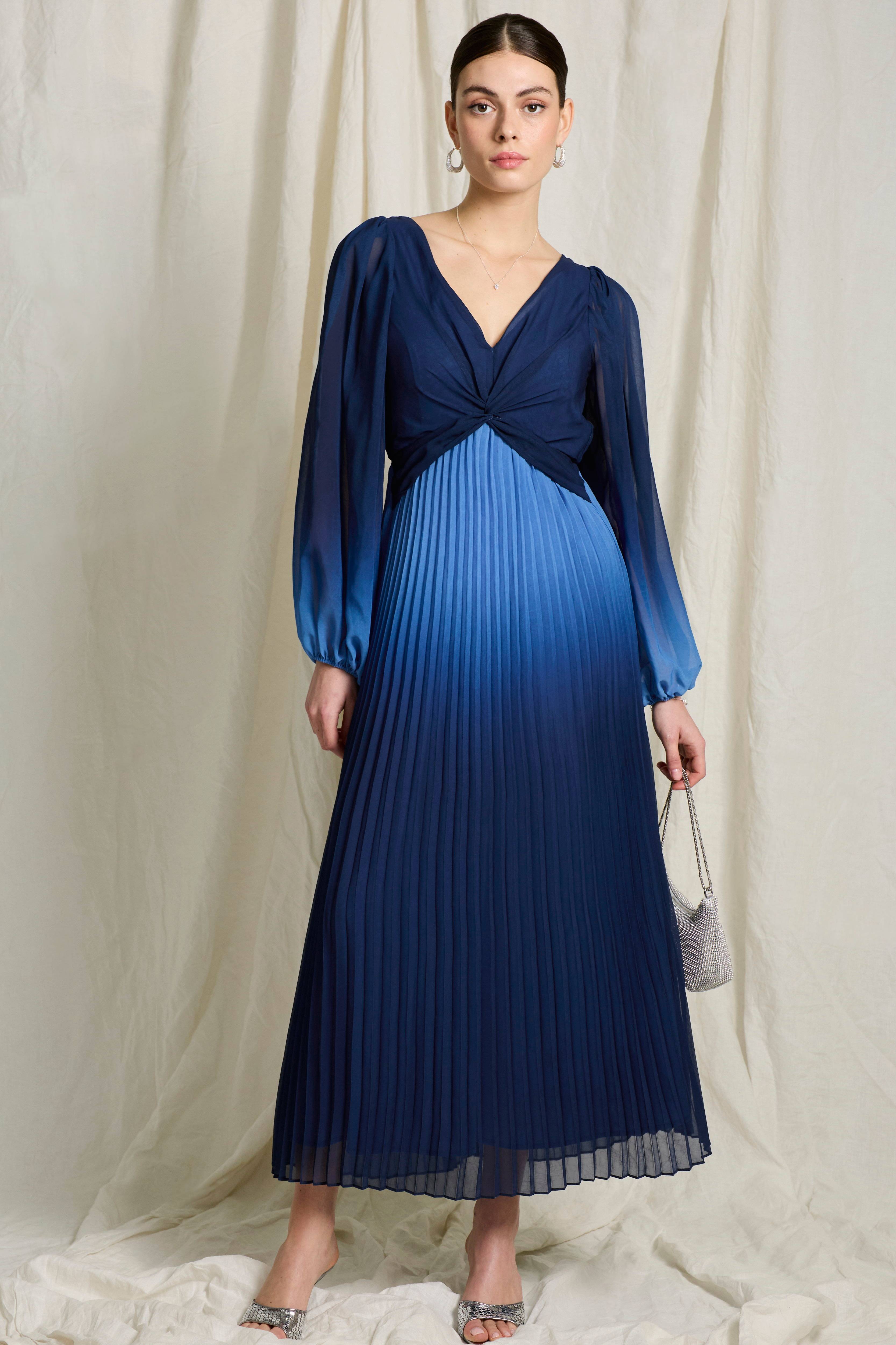• Langes, plissiertes Maxikleid aus Chiffon• V-Ausschnitt vorne und hinten• Knotendrapierung vorne• Schnürung am Hals• Transparente Ballonärmel mit elastischen Manschetten• Dünnes Futter• Länge: 138 cm in Größe 34/36